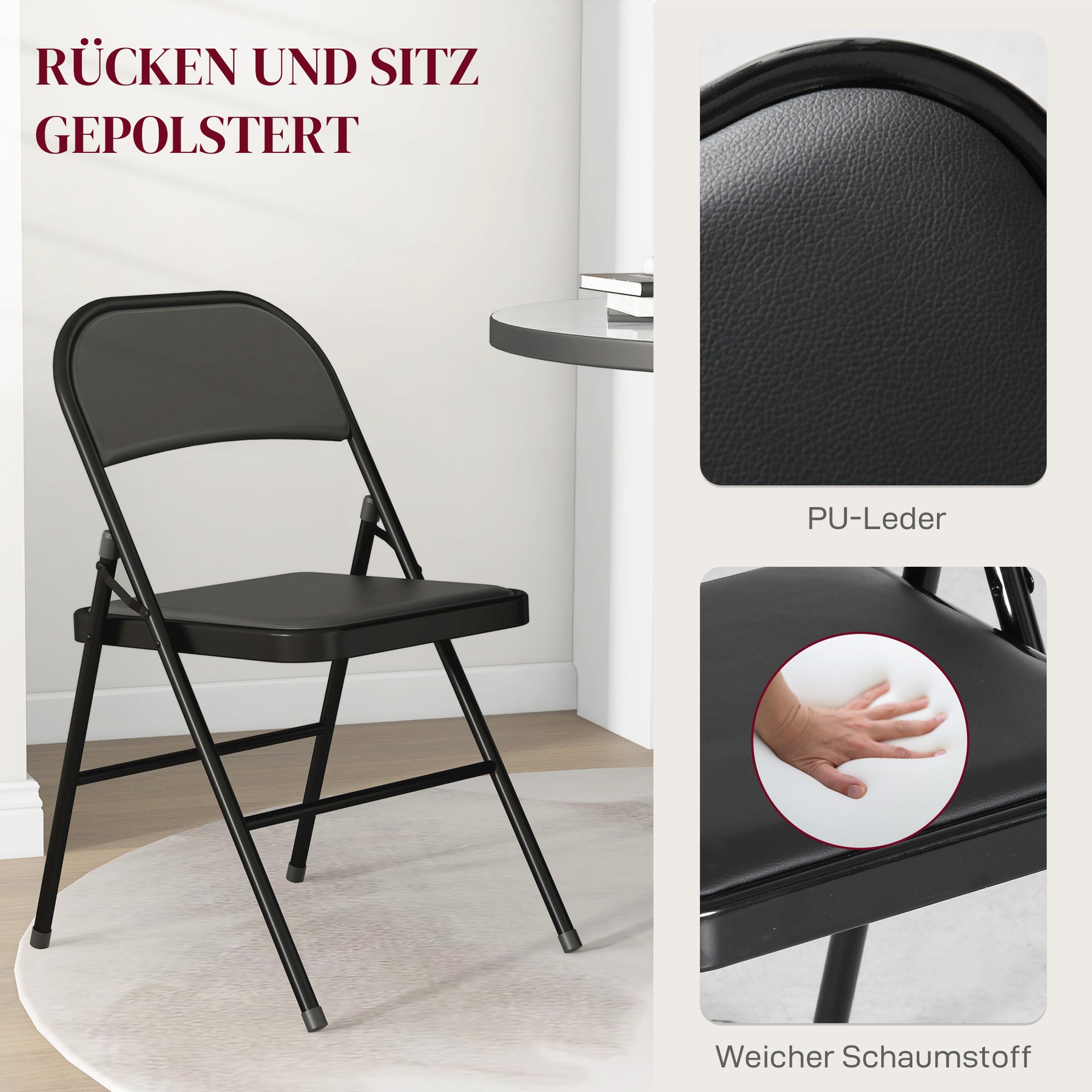 Sæt med 4 klapstole, bærbare kontorstole, metalben, klapstol til kontor, reception, venteværelse, kunstlæder, sort