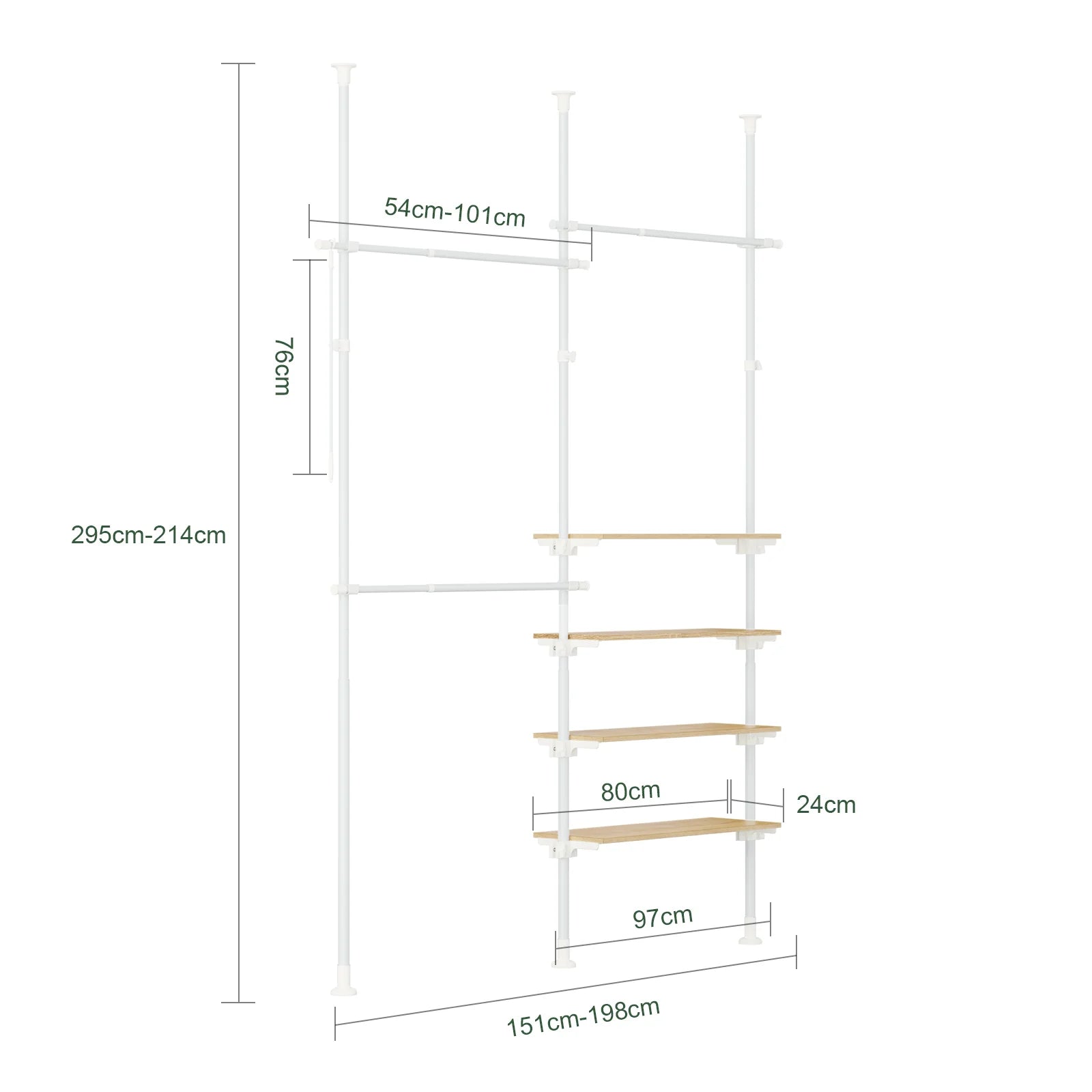 Mål: Bredde 151–198 cm, Højde 214–295 cm (justerbar)