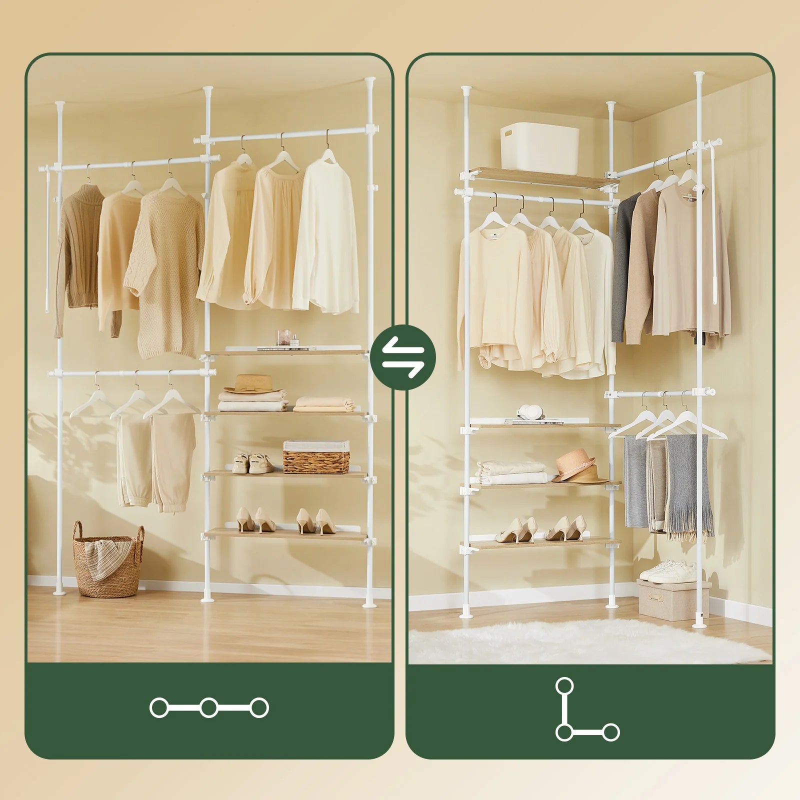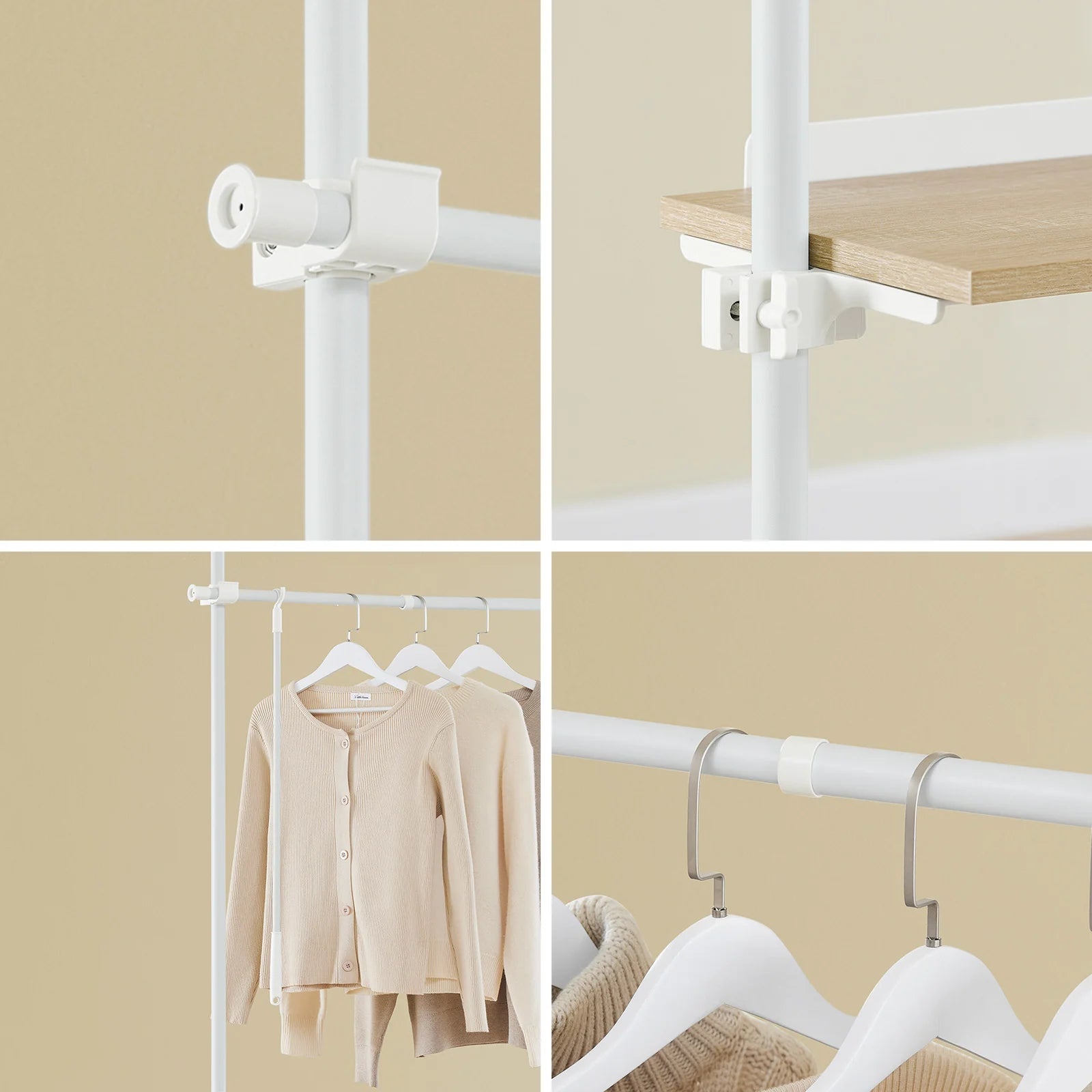 Skab orden og fleksibilitet i dit garderoberum med denne stilrene og praktiske garderobeløsning, der kan tilpasses dine behov.