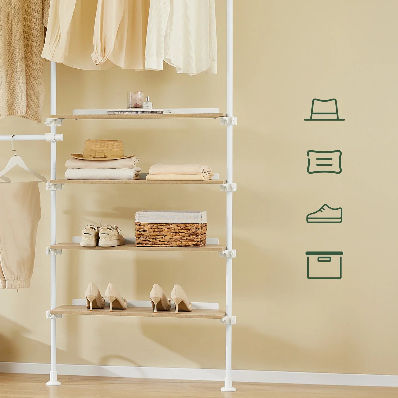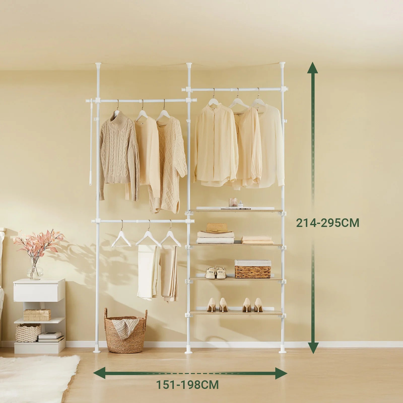 Få en alsidig og pladsbesparende garderobeløsning med denne justerbare, fritstående tøjstativ i hvidt design. Med teleskopstænger og hylder kan du skabe en åben garderobe, der tilpasses præcist til dit rum – uden brug af værktøj eller boring.