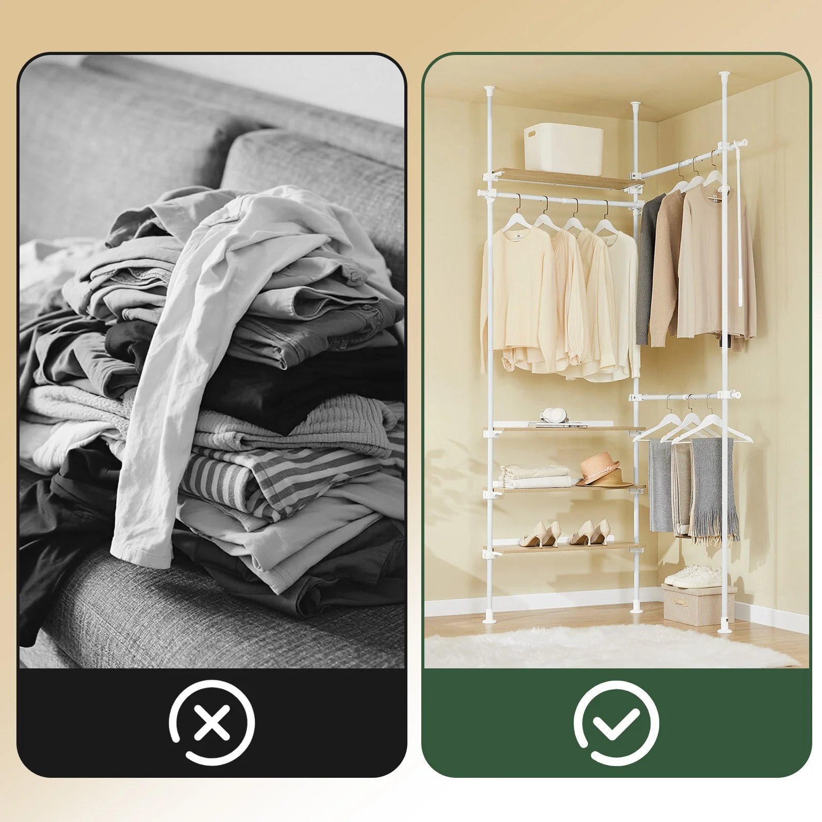 Denne robuste garderobe kan bære op til 70 kg og passer perfekt i soveværelse, entre eller walk-in closet, hvor den organiserer tøj, sko og tilbehør med optimal oversigt og ventilation.