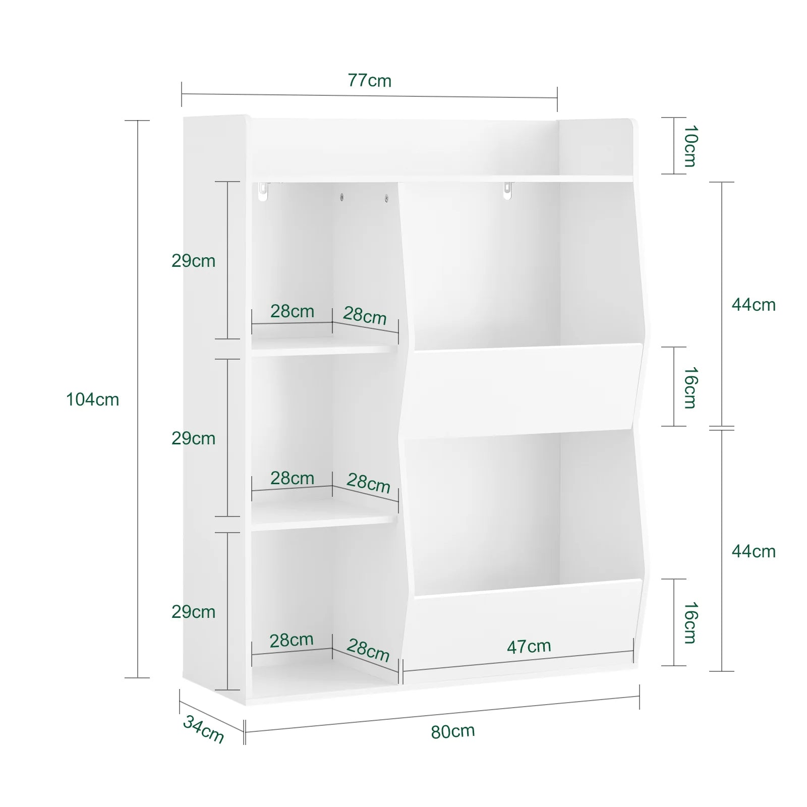 Bogreolen har afrundede kanter og et tipbeskyttelsessystem, der sikrer tryg leg og bevægelsesfrihed for de mindste. Med sin højde på 104 cm kan børn nemt nå alle hylder og lære at holde deres ting organiseret på egen hånd.