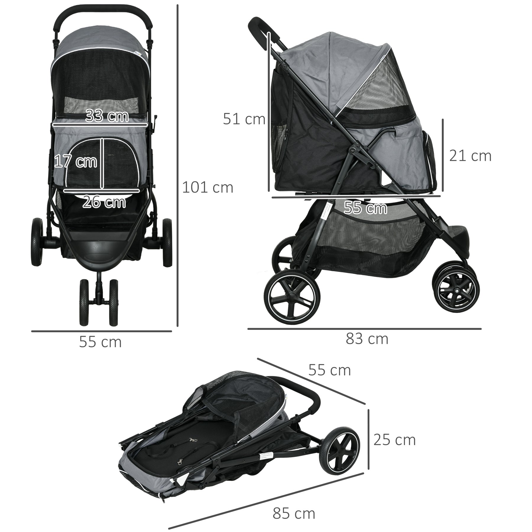Hundevogn kæledyrsvogn op til 10 kg sammenklappelig regnovertræk 2 sikkerhedssnore 83 cm x 55 cm x 101 cm grå + sort