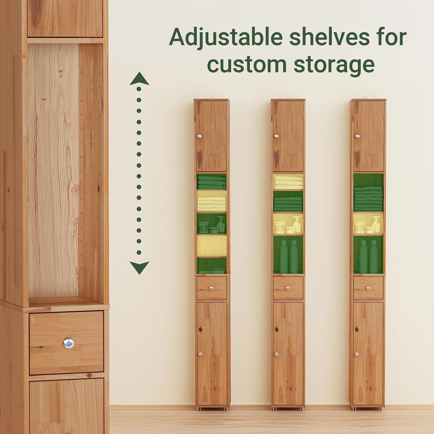De fem hylder i skabet er alle justerbare, så du nemt kan indrette det efter dine behov. Den praktiske skuffe i midten er perfekt til opbevaring af kosmetik, rengøringsprodukter eller andre badeværelsesartikler, og giver dig en fleksibel og tilpasset opbevaringsløsning.