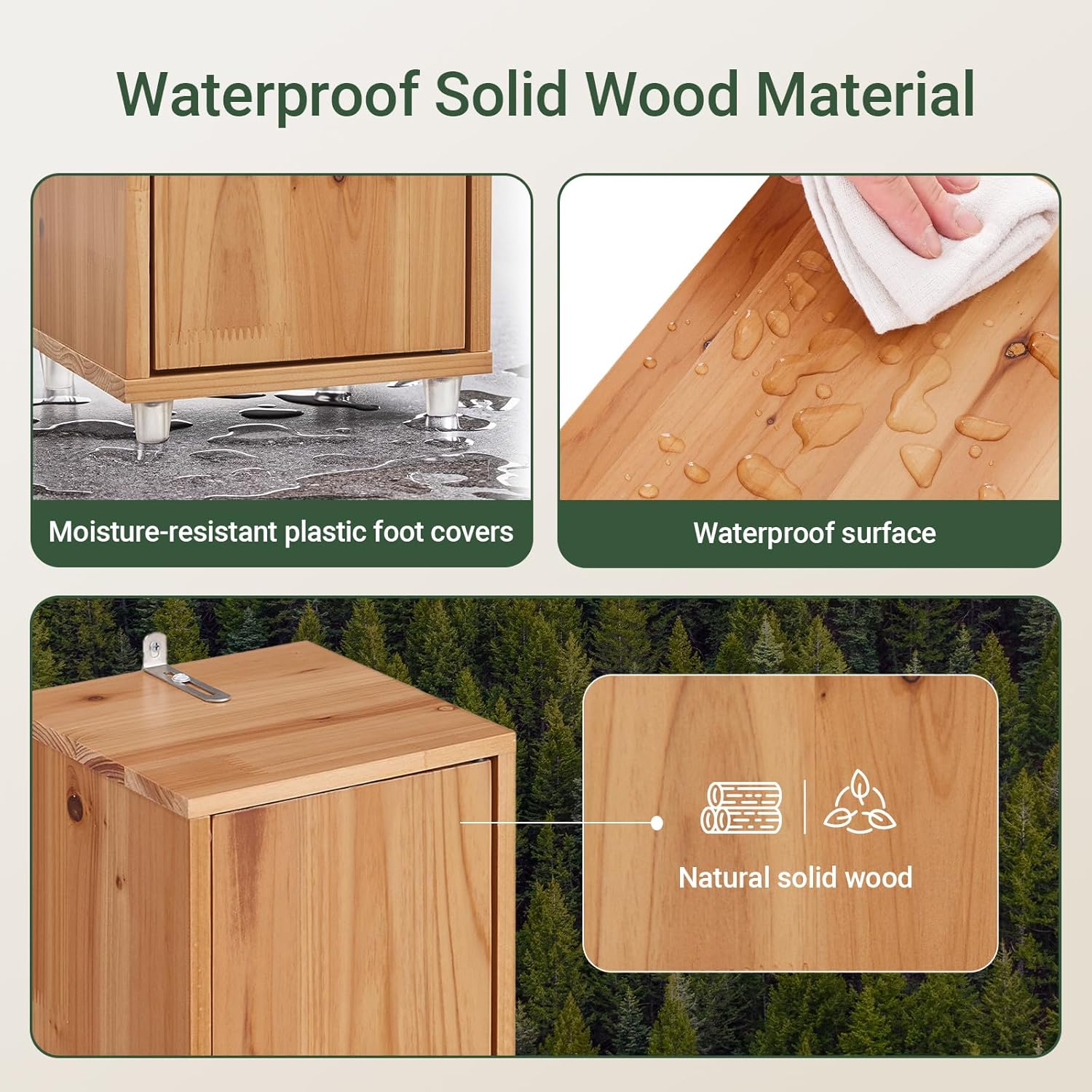 Skabet er fremstillet af massivt cedertræ med en elegant, lakeret overflade. Sammen med vandafvisende fødder giver det optimal beskyttelse mod fugt, hvilket sikrer en lang levetid.