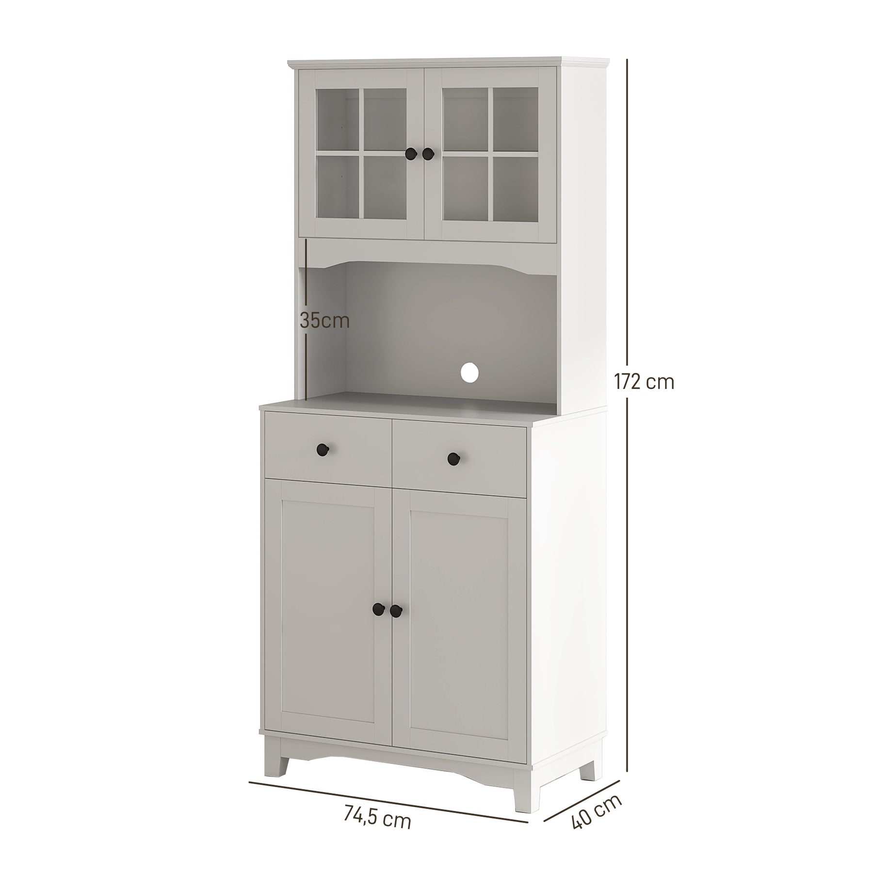 Skab orden og stil i dit hjem med dette rummelige vitrineskab. Med to skabe og to skuffer får du masser af opbevaringsplads til køkkenredskaber og dekorative genstande. Den store bordplade er ideel til en mikrobølgeovn eller kaffemaskine, og der er en praktisk åbning til strømkabler.