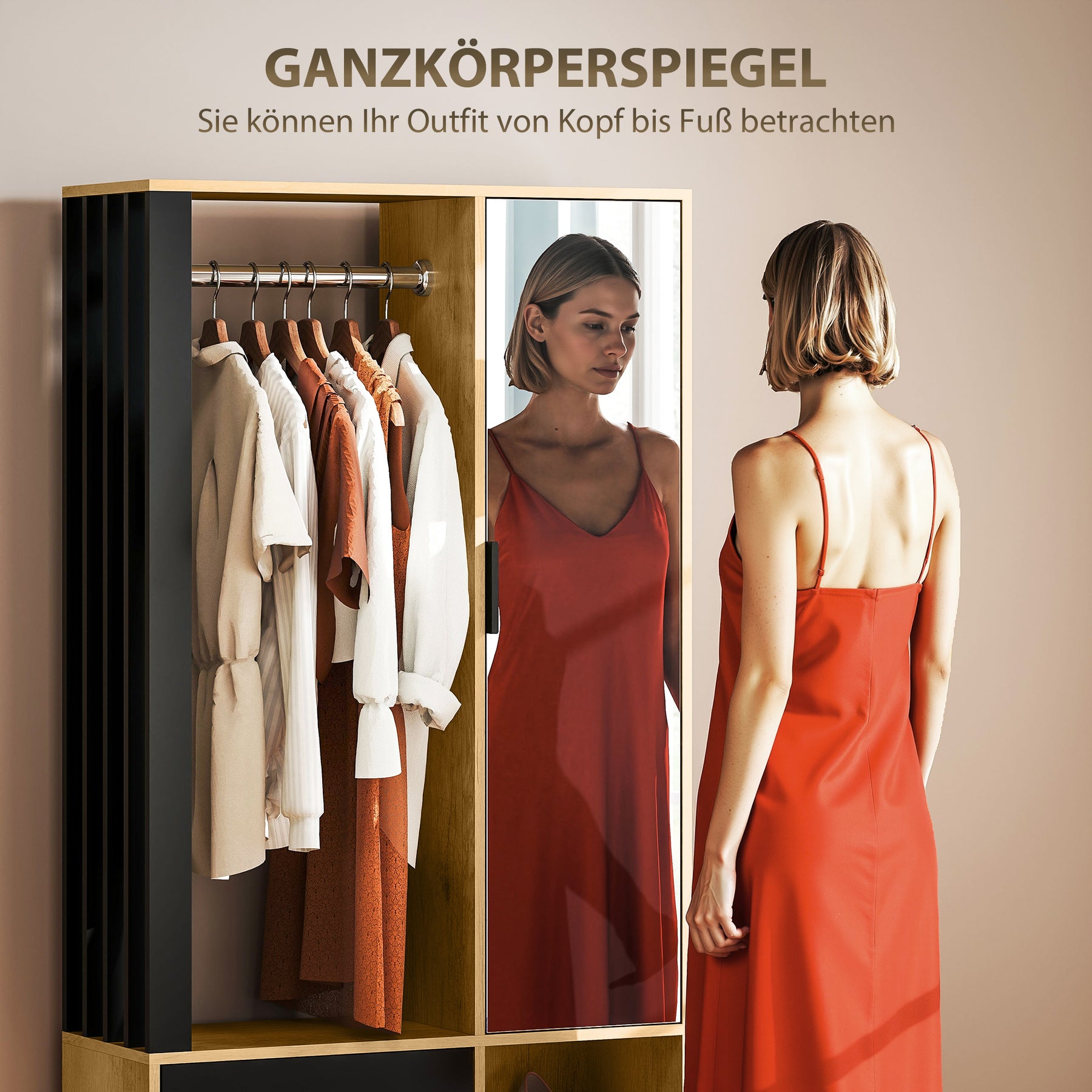 Oplev det moderne garderobesæt, der kombinerer elegance med funktionalitet. Nyd de åbne opbevaringsløsninger med rigelig hængeplads og skorum, alt sammen inden for rækkevidde. Takket være glas- og paneldørene forbliver det foldede tøj støvfrit, og det lange spejl giver dig mulighed for at tjekke dit outfit fra top til tå.