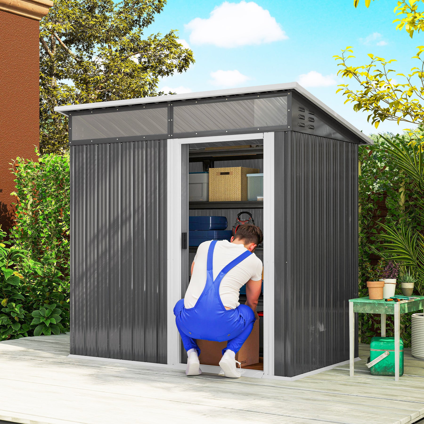 Sæt mere orden i dit havearbejde med dette praktiske haveredskabsskur. Det robuste metalredskabsskur har kroge til værktøj og et rummeligt interiør, oplyst af to klare vinduer. Skydedøren og det skrånende tagdesign holder alt tørt og ryddeligt, så du kan beskytte dit udstyr mod elementerne.