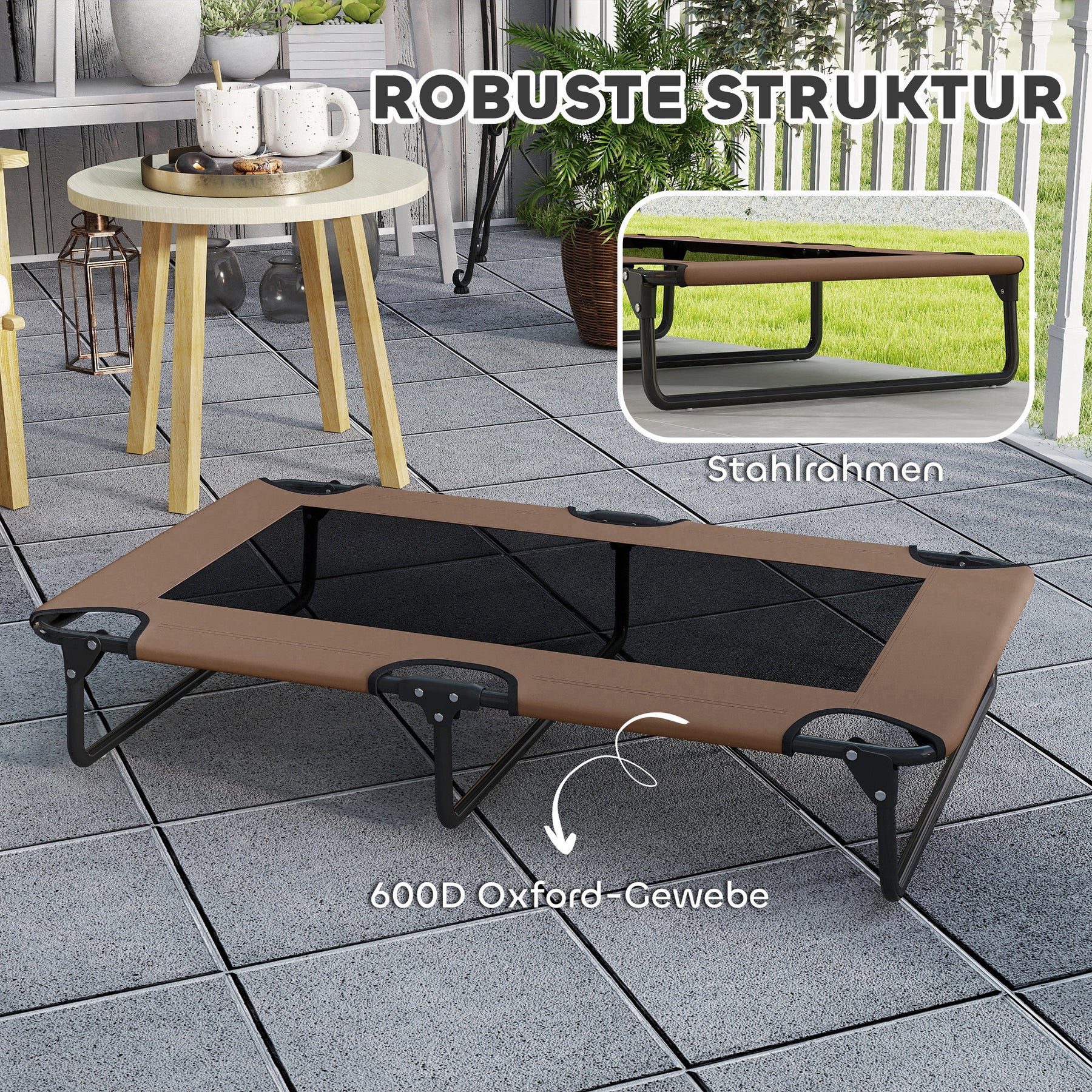 Den bærbare udendørs hundeseng med en robust stålramme og slidstærkt stof er ideel til både indendørs og udendørs brug. Giv din hund den bedste hvile!