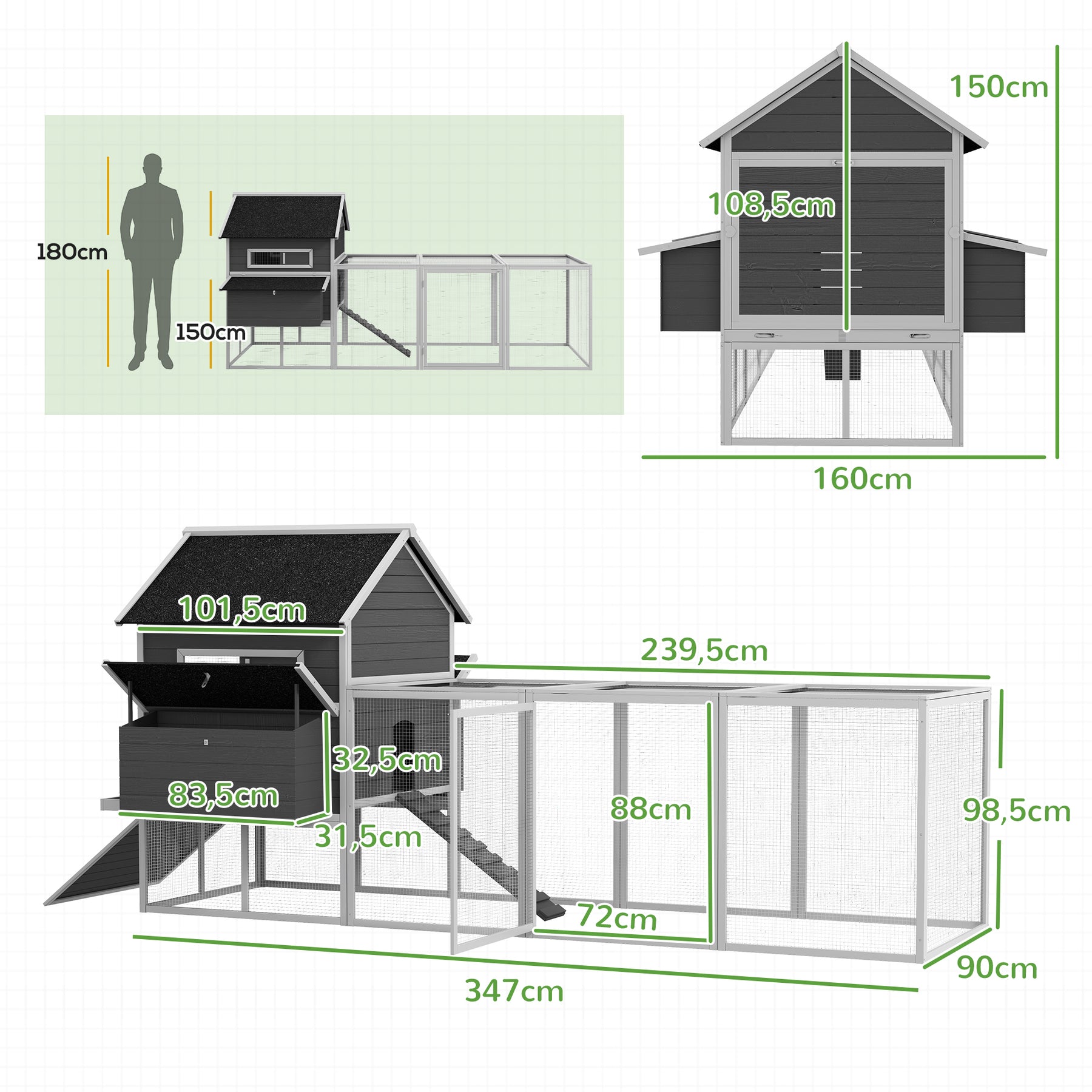 Hønsehus, hønsehus med 2 redekasser og løbegård, vejrbestandig, til 8-10 kyllinger, 347 x 160 x 150 cm, grå