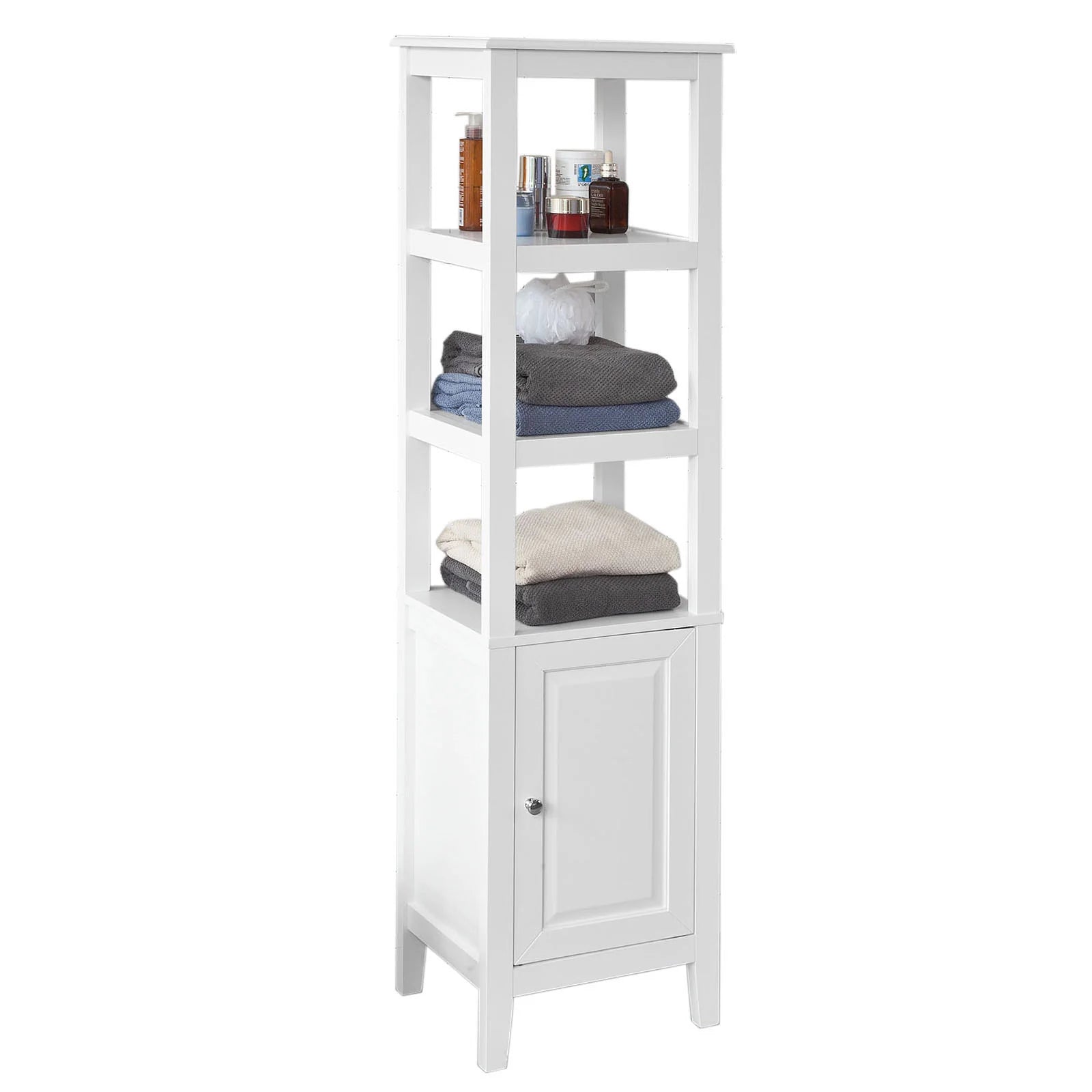 Opgrader dit badeværelse med dette elegante, hvide gulvskab, der giver masser af opbevaringsplads til alle dine badeværelsesartikler. Med sit tidløse design passer skabet perfekt ind i både moderne og traditionelle indretninger. Skabet har tre åbne hylder og et skab med en justerbar hylde, så du let kan organisere dine ting.