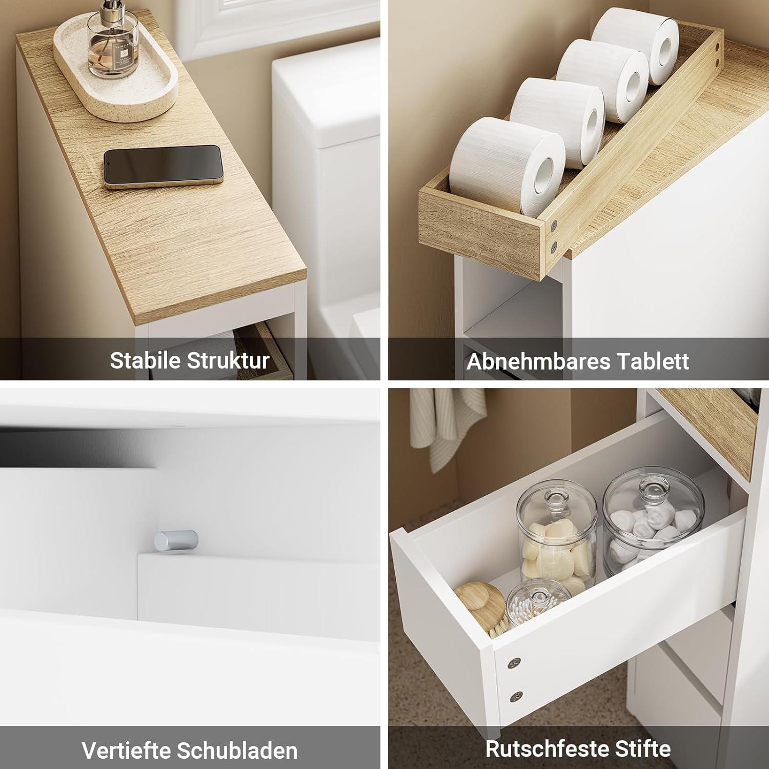 Den nichehylde med 3 store skuffer til hygiejneartikler og et fleksibelt flytbart opbevaringsrum gør det muligt at tilpasse opbevaringspladsen individuelt til dine behov. Den integrerede anti-vippeanordning sikrer sikker brug af skuffer, mens vandtætte fodpuder i bunden giver ekstra beskyttelse mod fugt. Ideel til organiseret og pæn opbevaring på badeværelset, toilettet eller køkkenet.