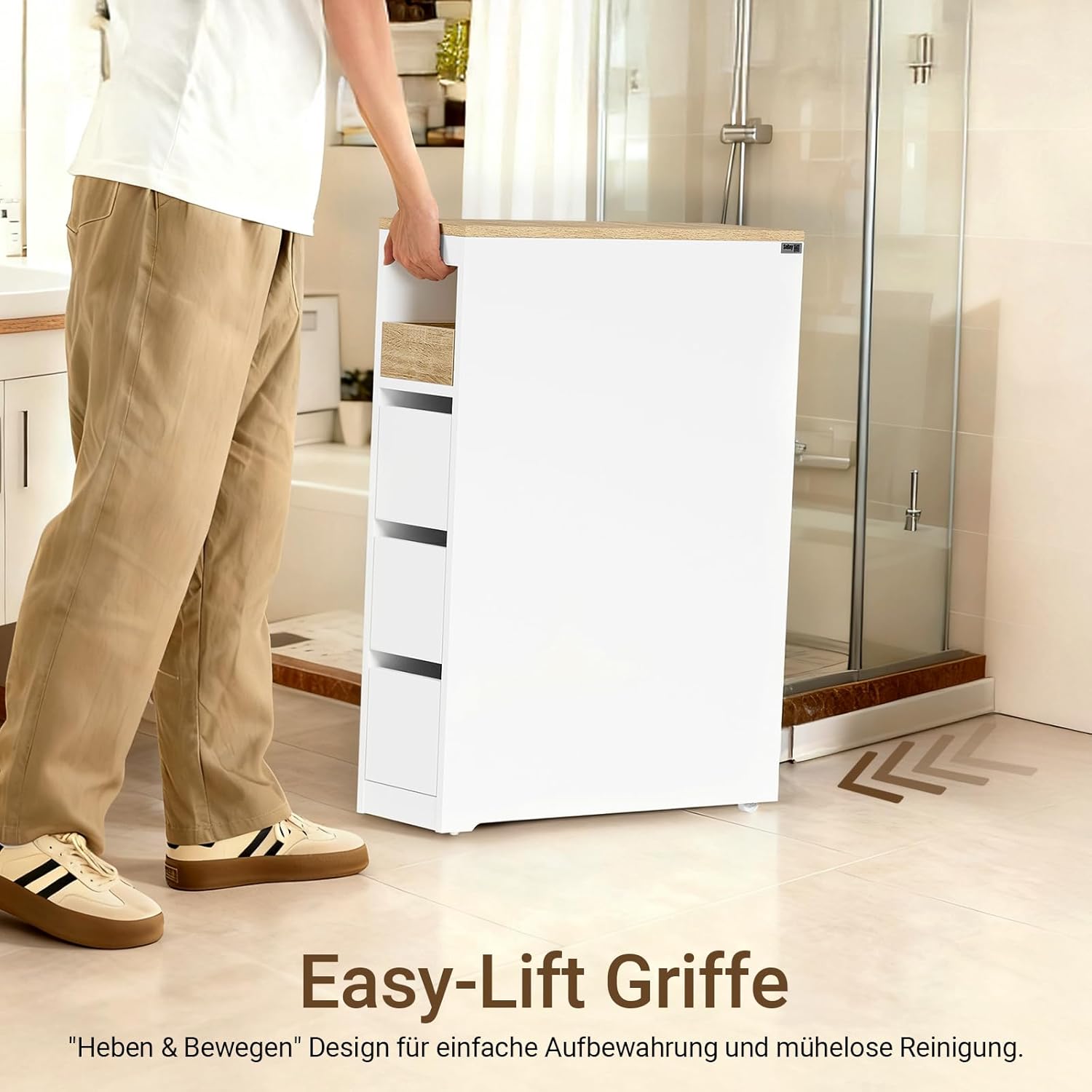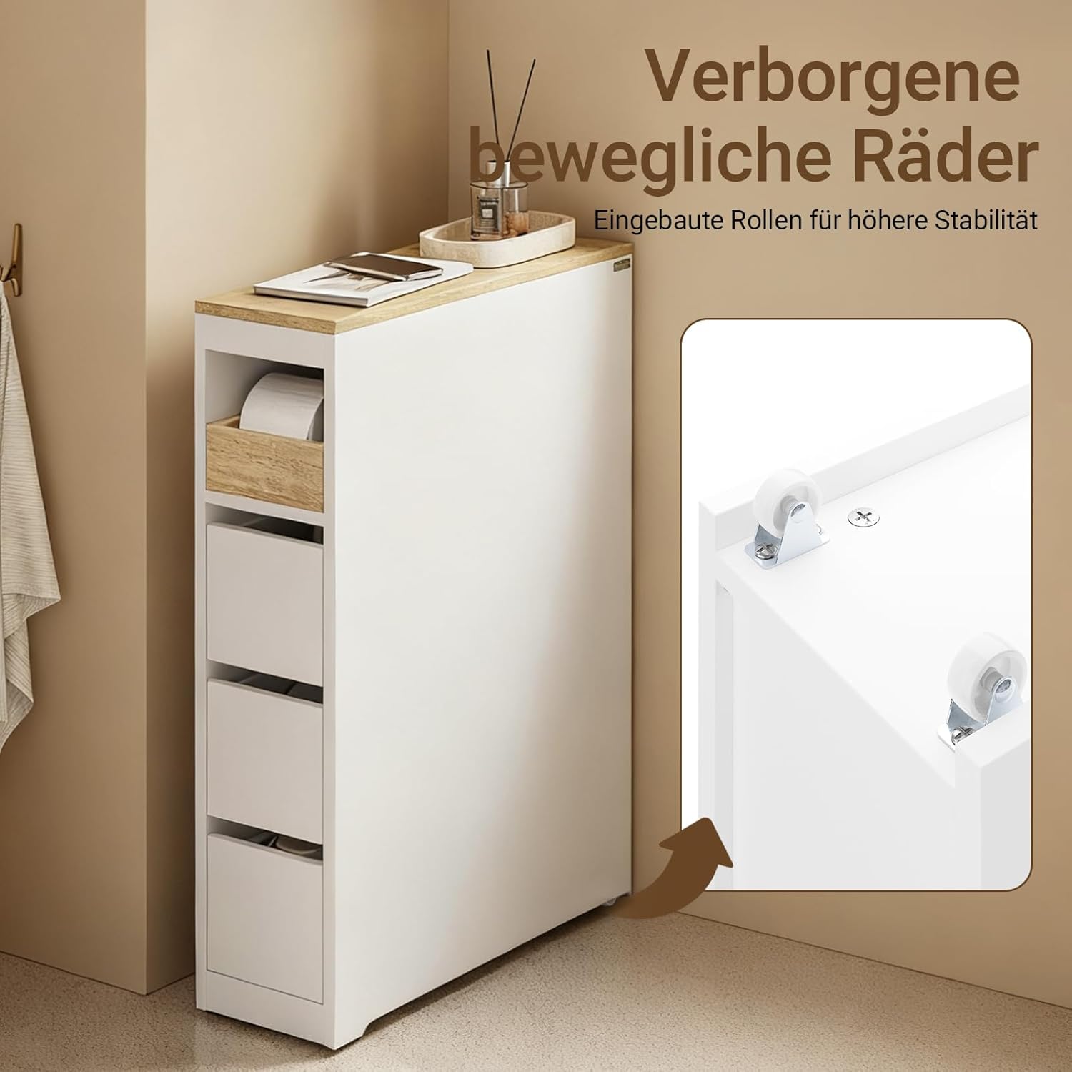 Badeværelseskab - 20 cm smalt med ruller og 3 skuffer, kompakte dimensioner, maksimeret opbevaringsplads