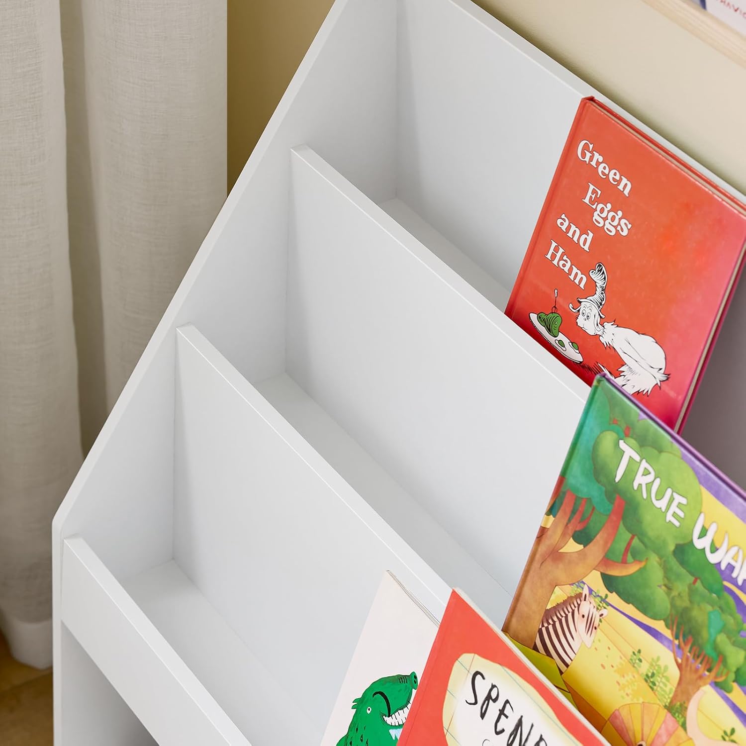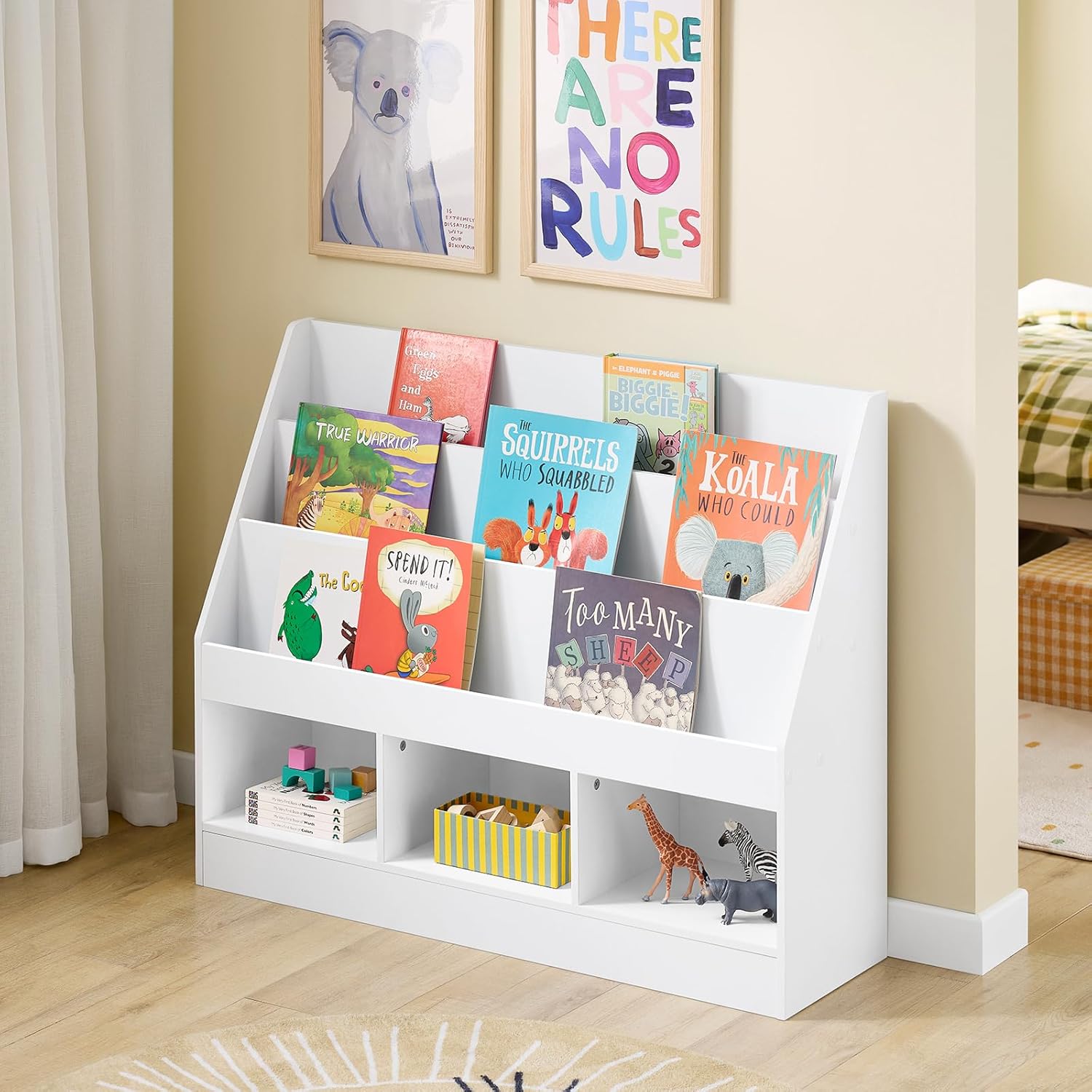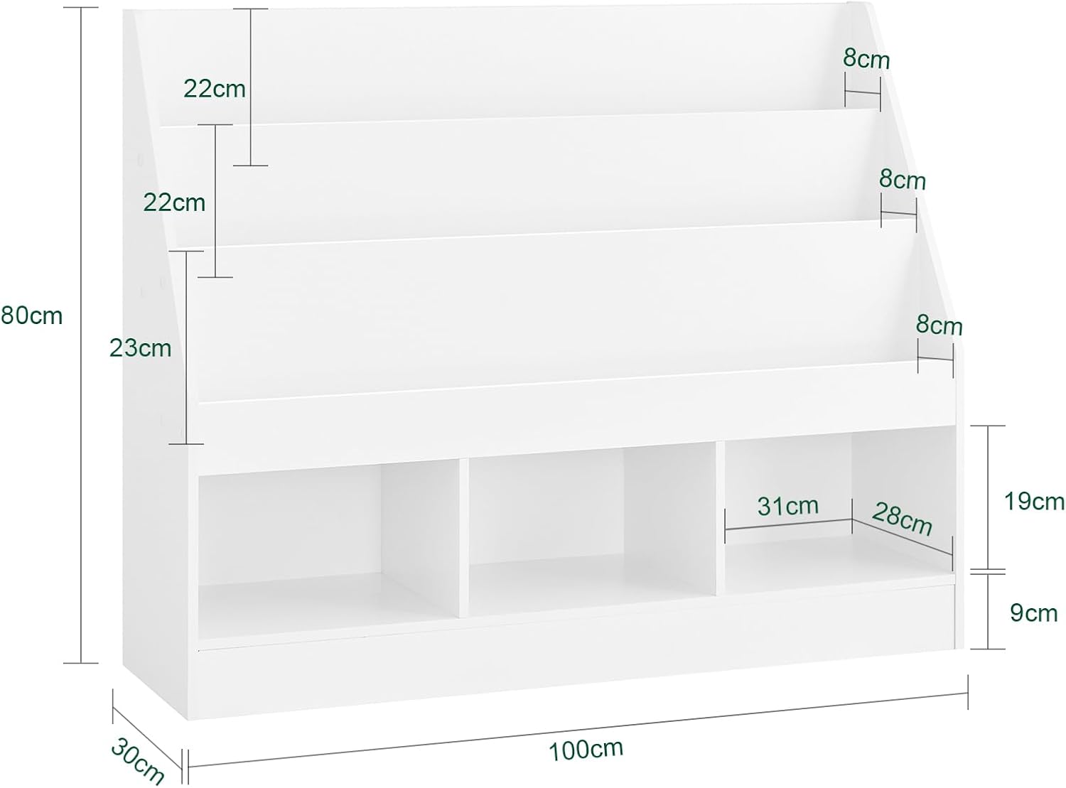Den er fremstillet af PB(E1)-plader uden maling>, hvilket garanterer et sundere og mere sikkert miljø for dit barn. Praktisk opbevaring med plads til alt Reolens øverste del har en frontvendt boghylde, der er ideel til at vise børnenes yndlingsbøger. Dette gør det nemt for dem at genkende og få fat i bøgerne.