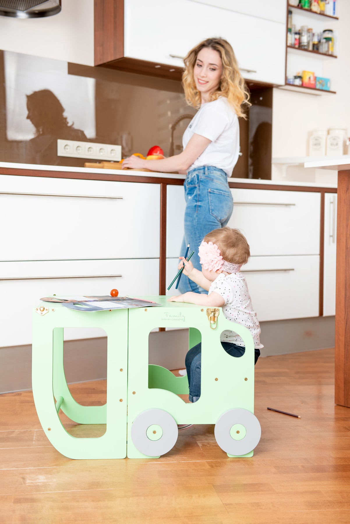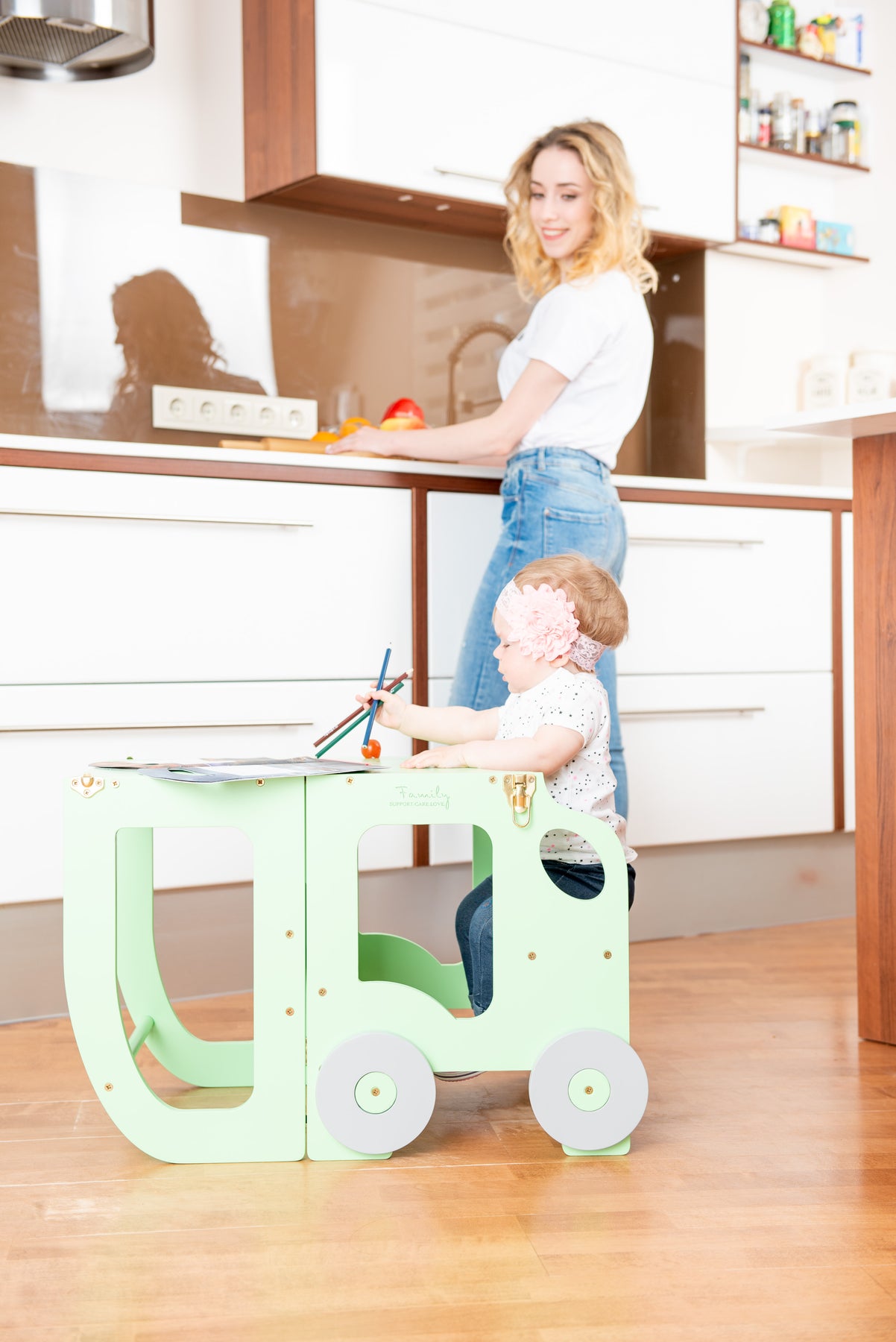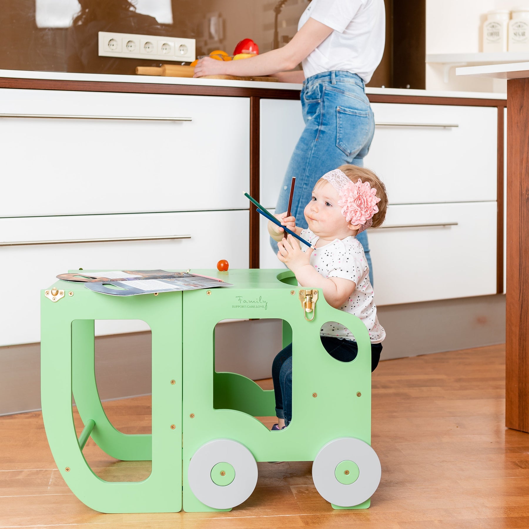 Denne montessori-inspirerede køkkentrapper, der nemt kan omdannes til bord og stol, er designet og skabt til læring, madlavning, klatring, siddeplads ved det store familiarbord samt spisning eller bare leg. Og det mest spændende er, at den ligner et legetøj og kan blive en god ven for dit barn.