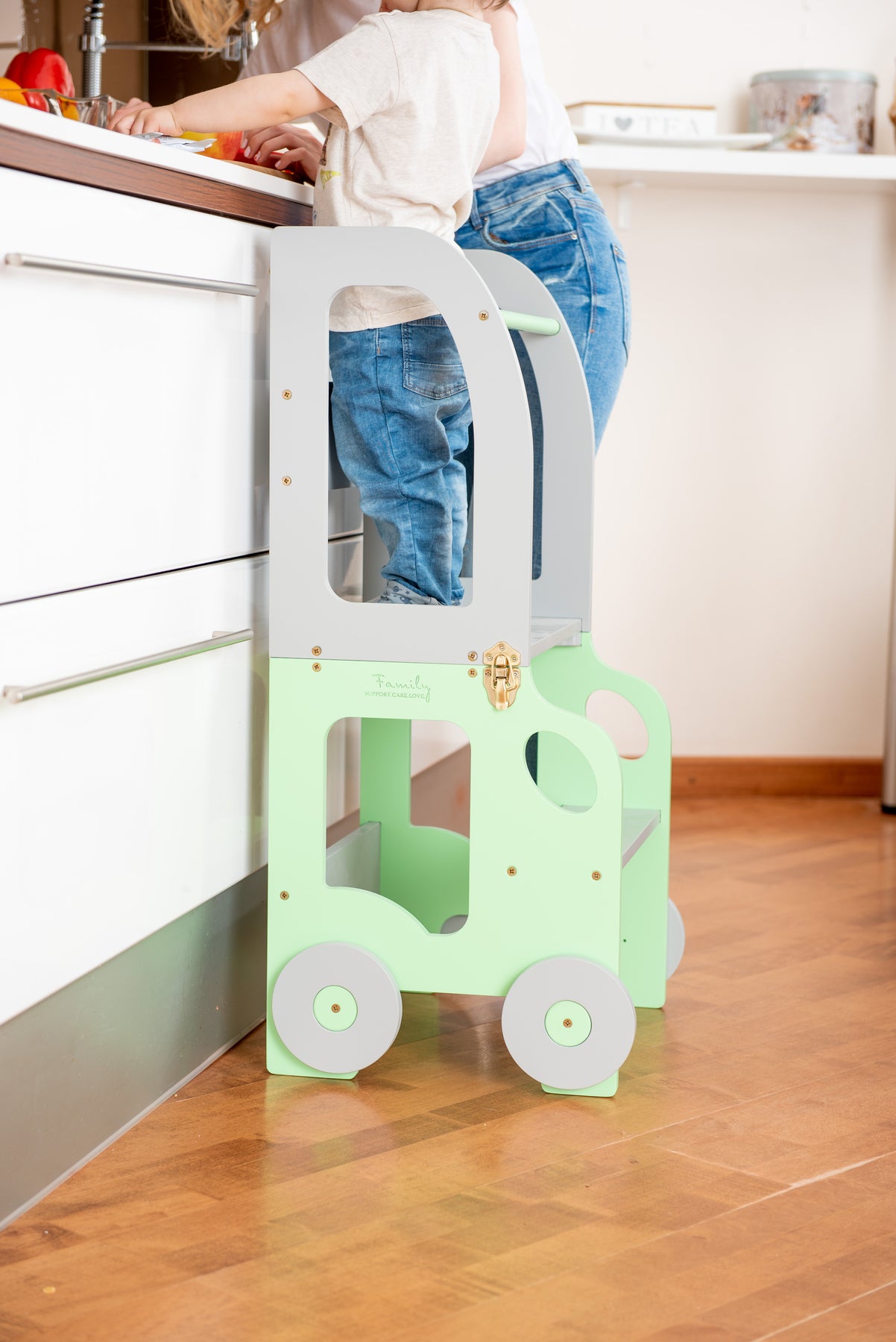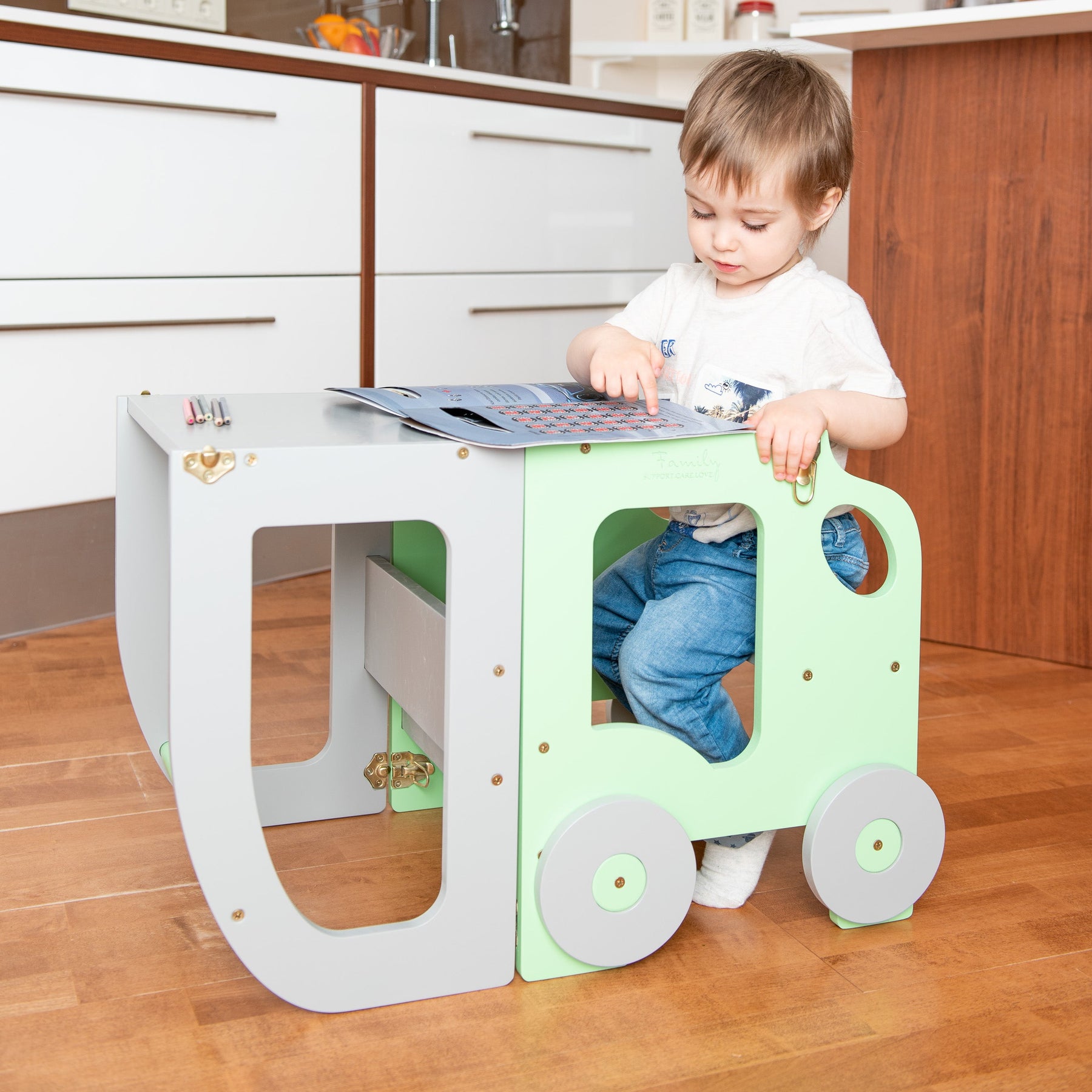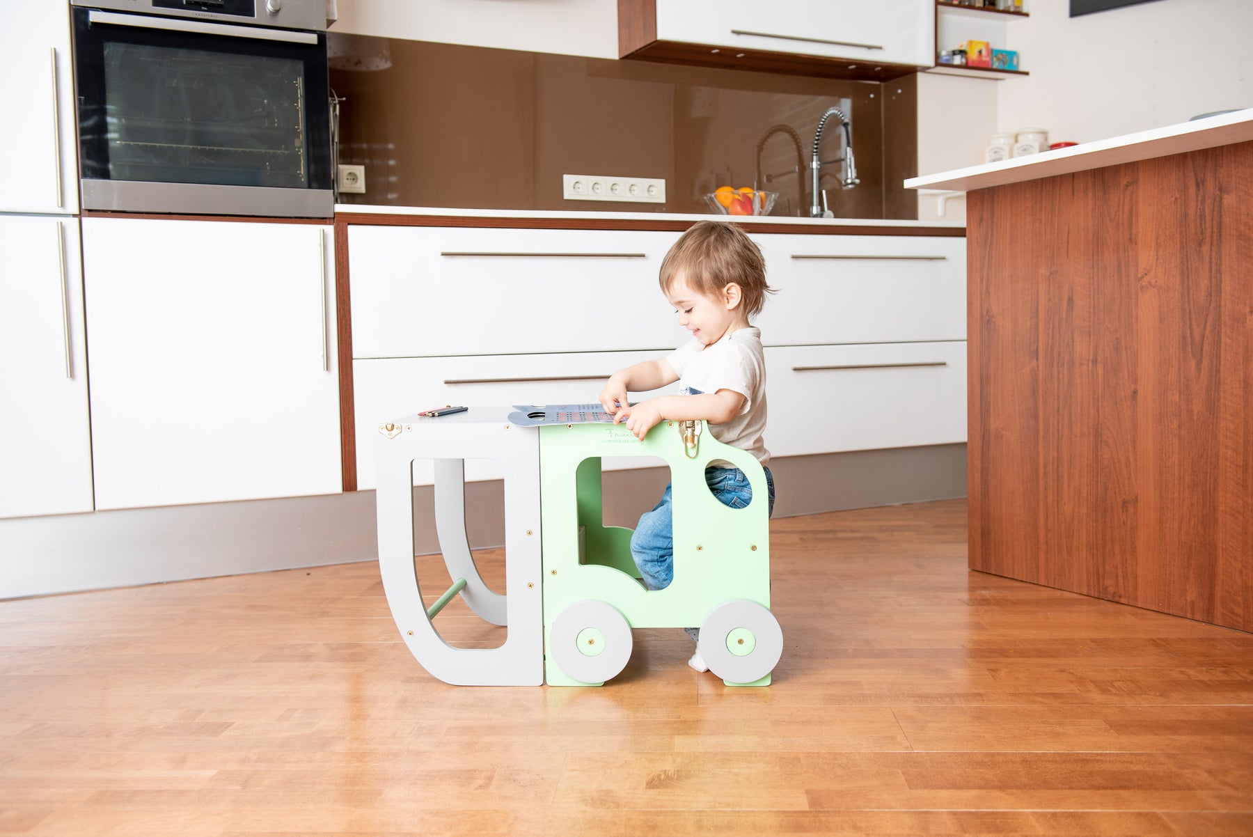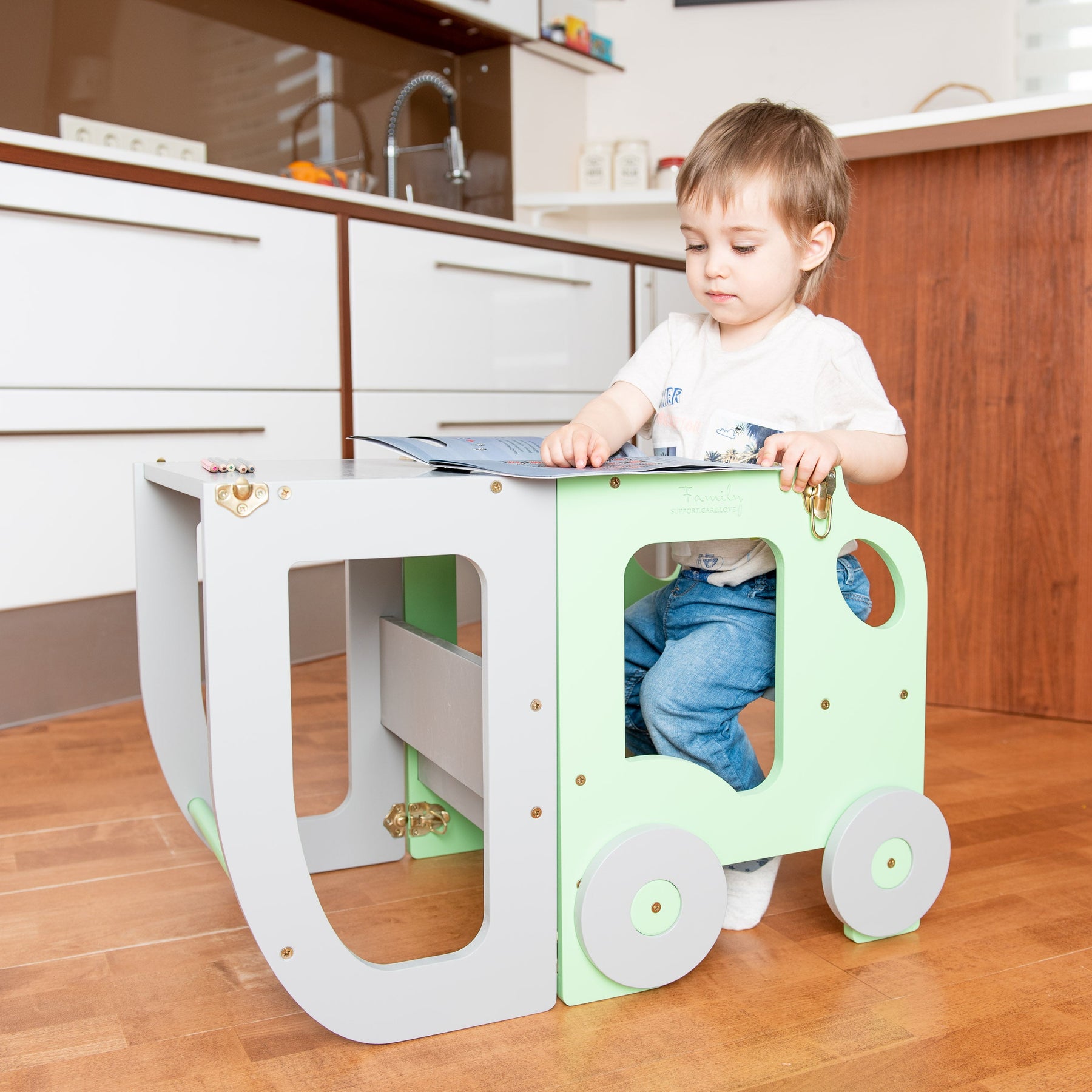 Denne montessori-inspirerede køkkentrapper, der nemt kan omdannes til bord og stol, er designet og skabt til læring, madlavning, klatring, siddeplads ved det store familiarbord samt spisning eller bare leg. Og det mest spændende er, at den ligner et legetøj og kan blive en god ven for dit barn.