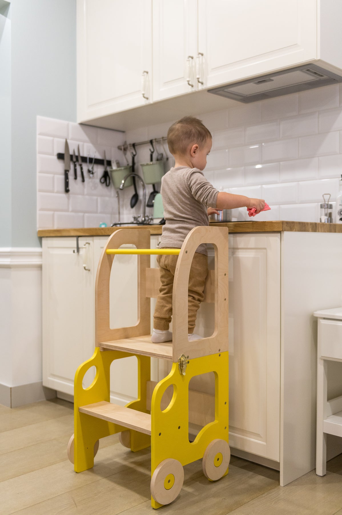 Denne montessori-inspirerede køkkentrapper, der nemt kan omdannes til bord og stol, er designet og skabt til læring, madlavning, klatring, siddeplads ved det store familiarbord samt spisning eller bare leg. Og det mest spændende er, at den ligner et legetøj og kan blive en god ven for dit barn.