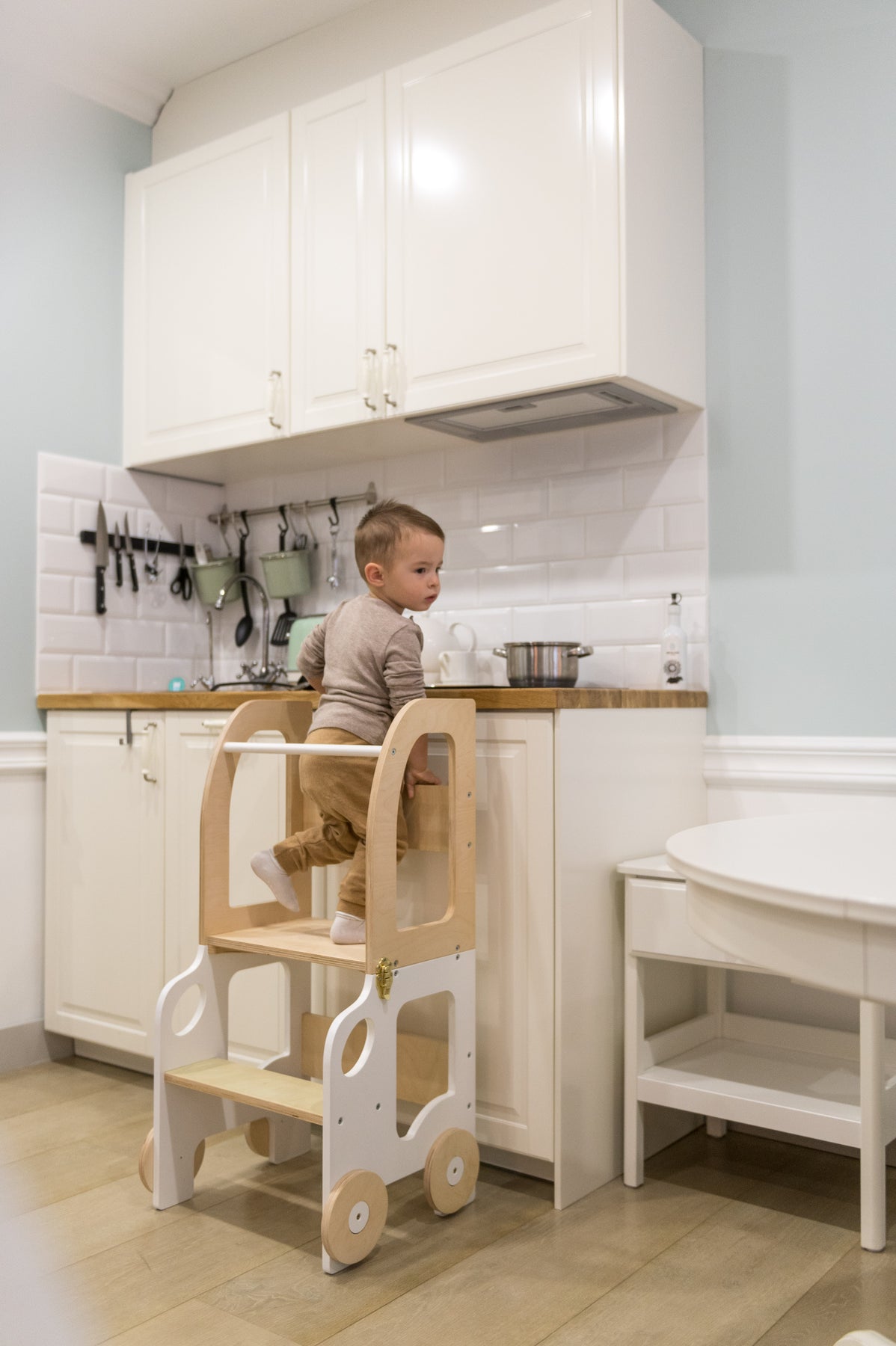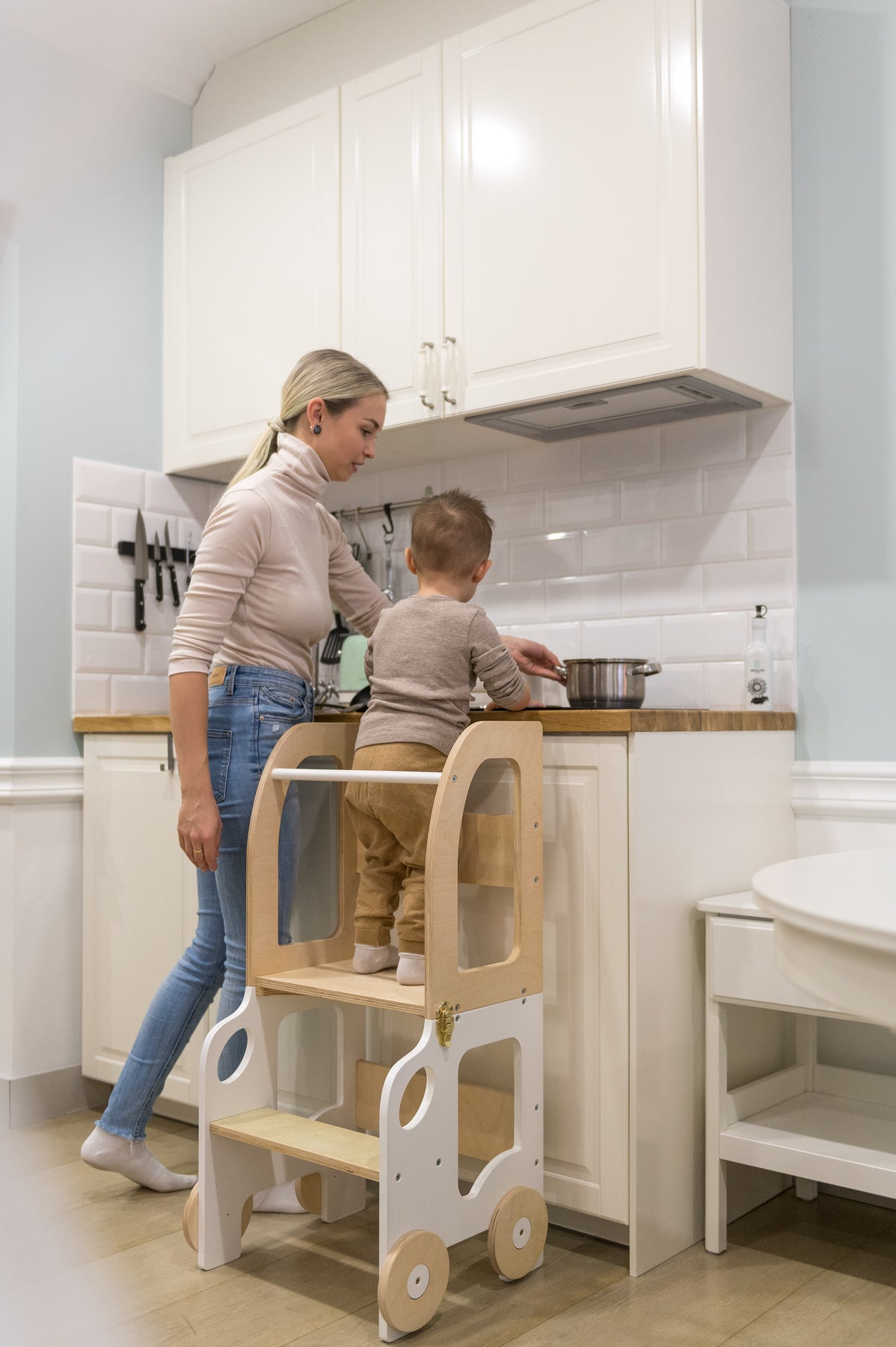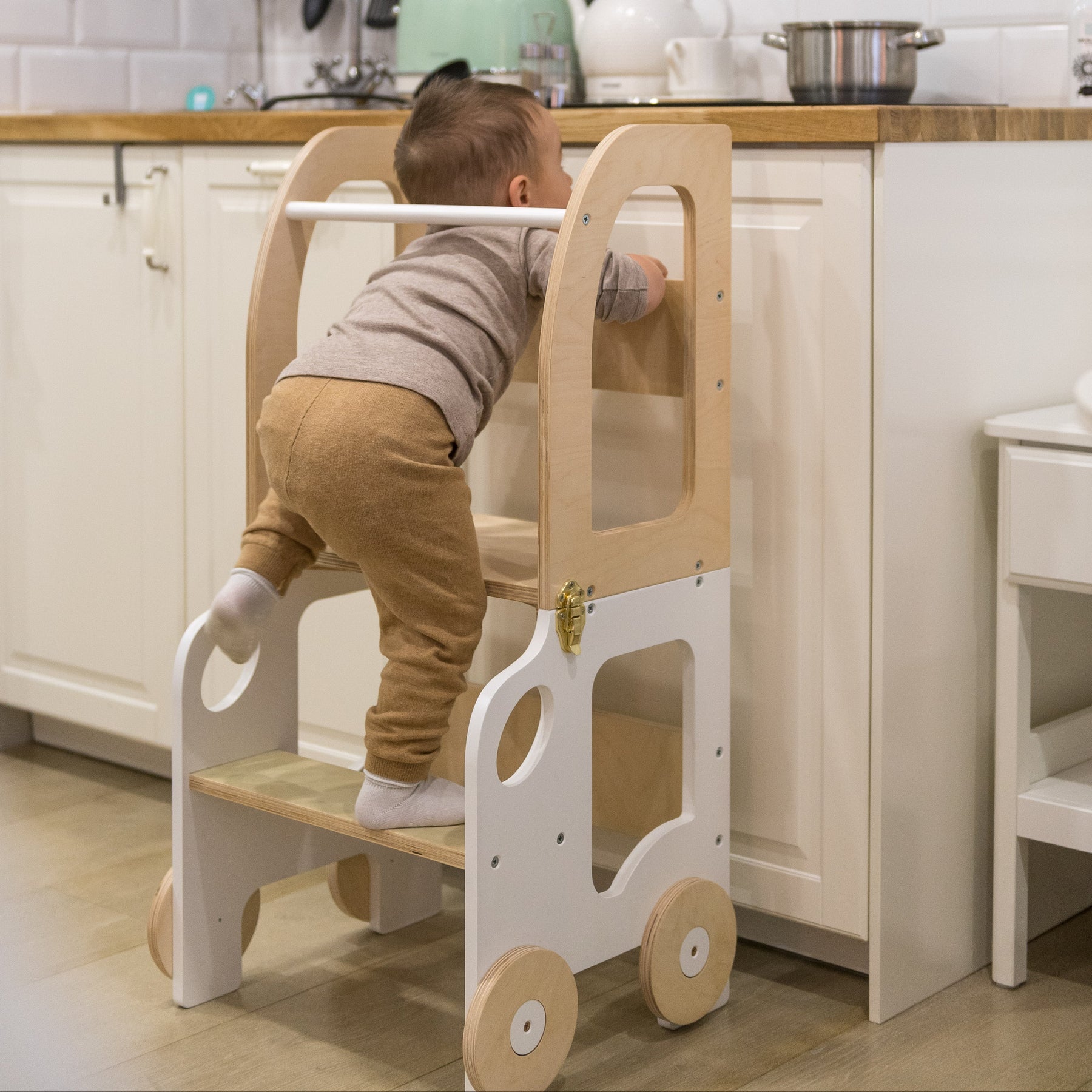 Denne montessori-inspirerede køkkentrapper, der nemt kan omdannes til bord og stol, er designet og skabt til læring, madlavning, klatring, siddeplads ved det store familiarbord samt spisning eller bare leg. Og det mest spændende er, at den ligner et legetøj og kan blive en god ven for dit barn.