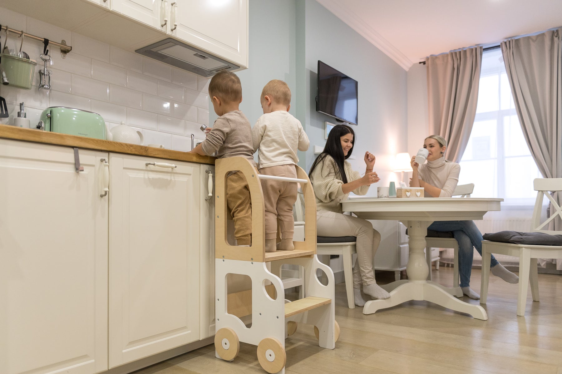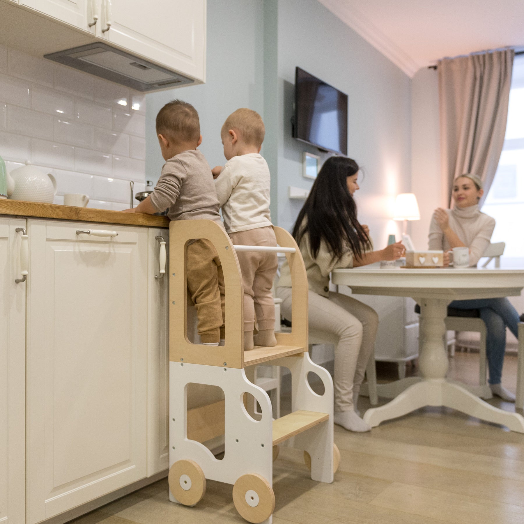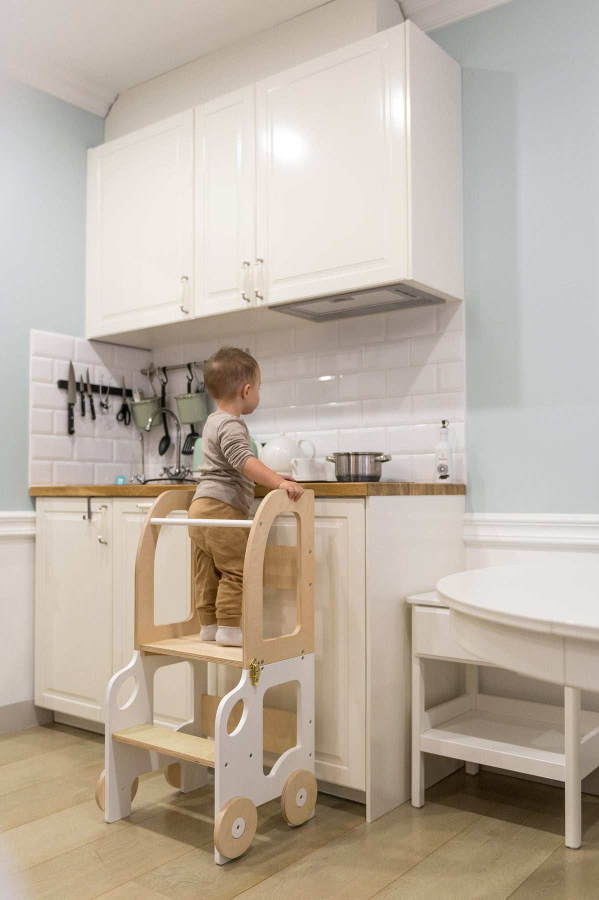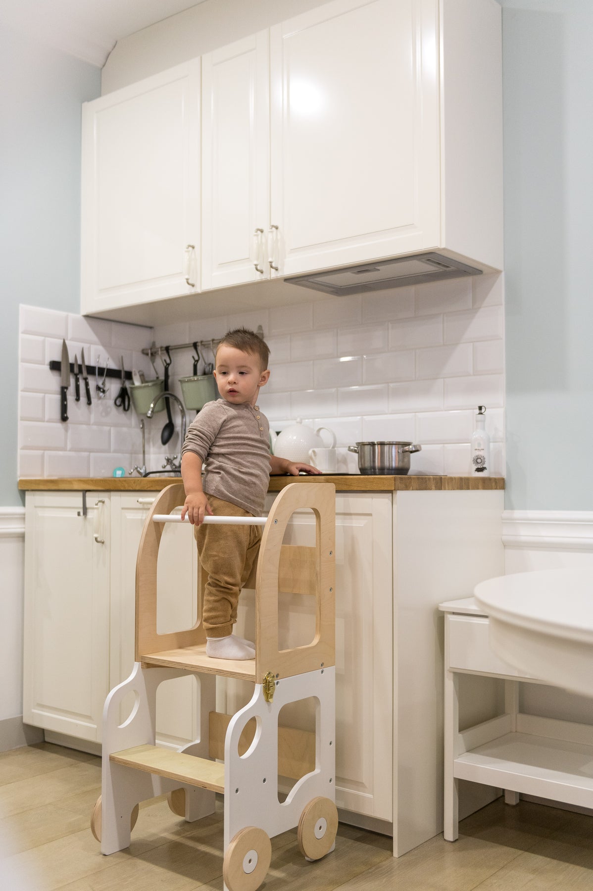 Denne montessori-inspirerede køkkentrapper, der nemt kan omdannes til bord og stol, er designet og skabt til læring, madlavning, klatring, siddeplads ved det store familiarbord samt spisning eller bare leg. Og det mest spændende er, at den ligner et legetøj og kan blive en god ven for dit barn.