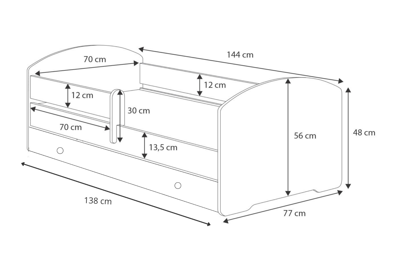 LUK-modellen kombinerer robust konstruktion, sikkerhed og komfort. Det bevægelige sengehest gør sengen velegnet til både mindre børn, der har brug for ekstra beskyttelse, og ældre børn, der kan bruge den efter behov. Den komfortable madras, der medfølger, er designet til en sund og afslappende søvn for dit barn, mens den rummelige skuffe giver praktisk opbevaring til sengetøj, legetøj eller tøj, hvilket hjælper med at holde rummet ryddeligt. Derudover minimerer de afrundede kanter og PVC-beskyttede kanter risikoen for skader og sikrer det højeste sikkerhedsniveau. Sengen er lavet af certificerede, holdbare materialer, hvilket ikke kun garanterer dens levetid, men også dens venlighed over for miljøet og dit barns helbred. Takket være det unikke print bliver møblerne rummets midtpunkt og kombinerer praktiske funktioner med dekorative kvaliteter.
