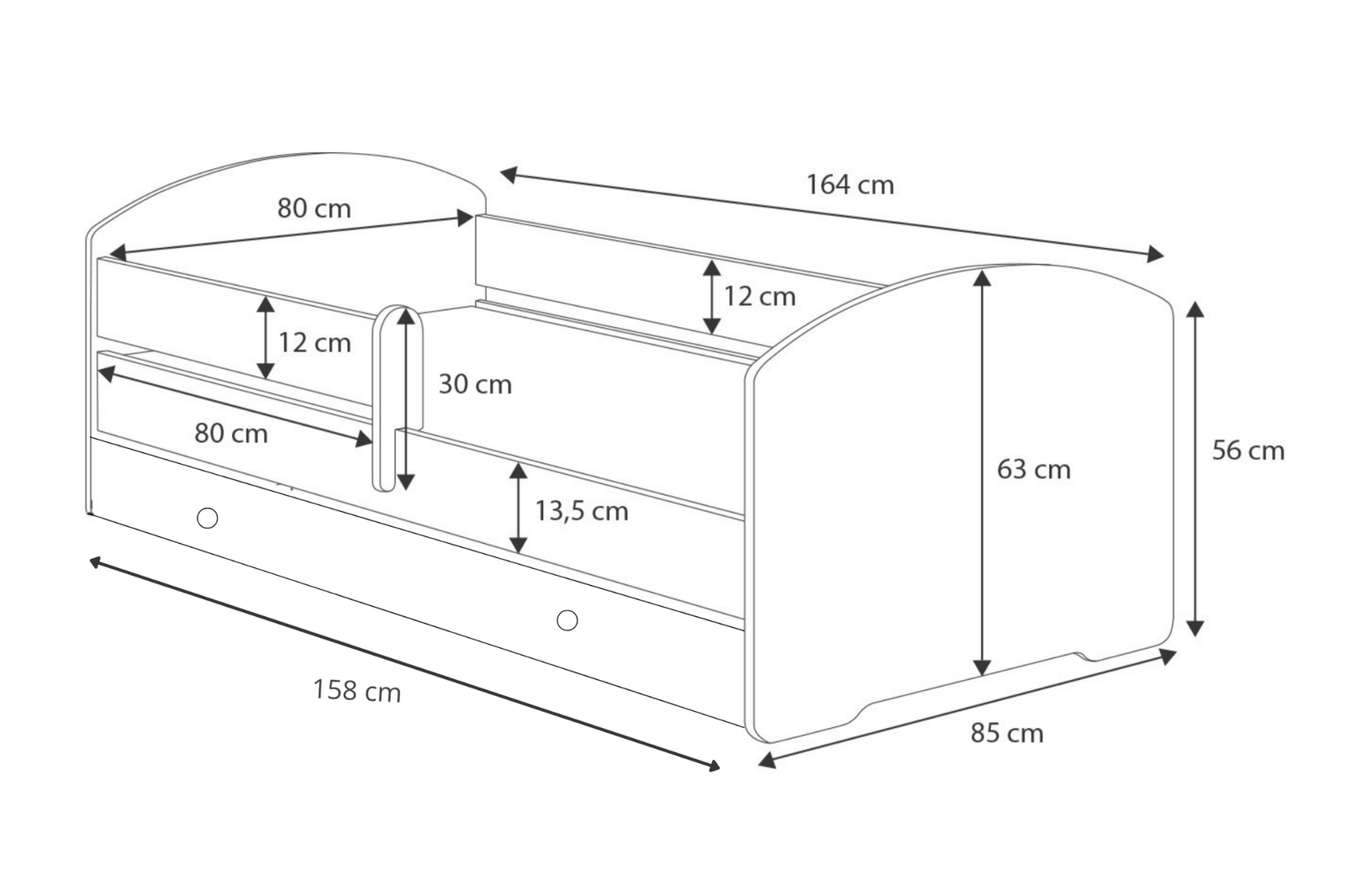 Kobi LUK børnesengen i størrelsen 160x80 cm er den ideelle løsning for forældre, der leder efter et funktionelt og æstetisk tiltalende møbel, der også vil glæde de yngste brugere. Sengen er dekoreret med et farverigt børneprint på forsiden og bringer et muntert og unikt præg til børneværelset, samtidig med at den bevarer en universel hvid farve, der er nem at matche med enhver indretning.