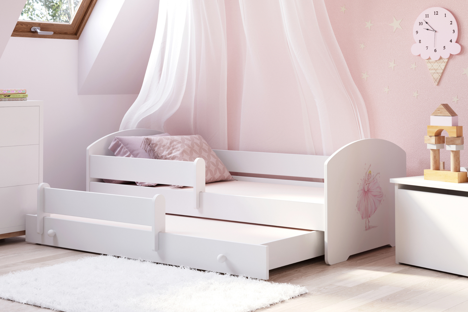 LUK II-modellen er en hvid Kobi-børneseng beriget med et muntert børneprint på forsiden, der perfekt kombinerer praktisk anvendelighed med æstetisk appel. Den indbyggede skuffe, der fungerer som ekstra soveplads, er den ideelle løsning til gæstebesøg eller søskendes overnatning sammen. Takket være det universelle hvide farveskema og det farverige print passer sengen perfekt ind i indretningen af både pige- og drengeværelser, hvilket giver den en unik karakter.
