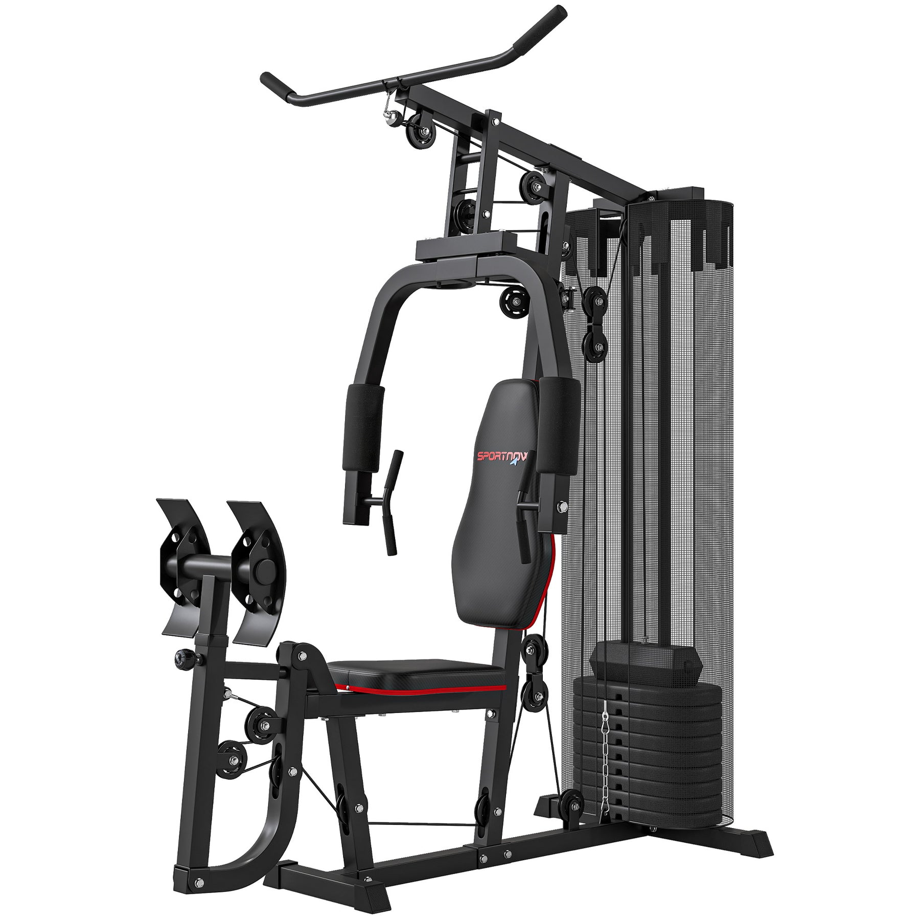 Hjemmefitnessstation med 45 kg vægtblokke, højt rebtræk, bryststation og benpres til alsidig træning