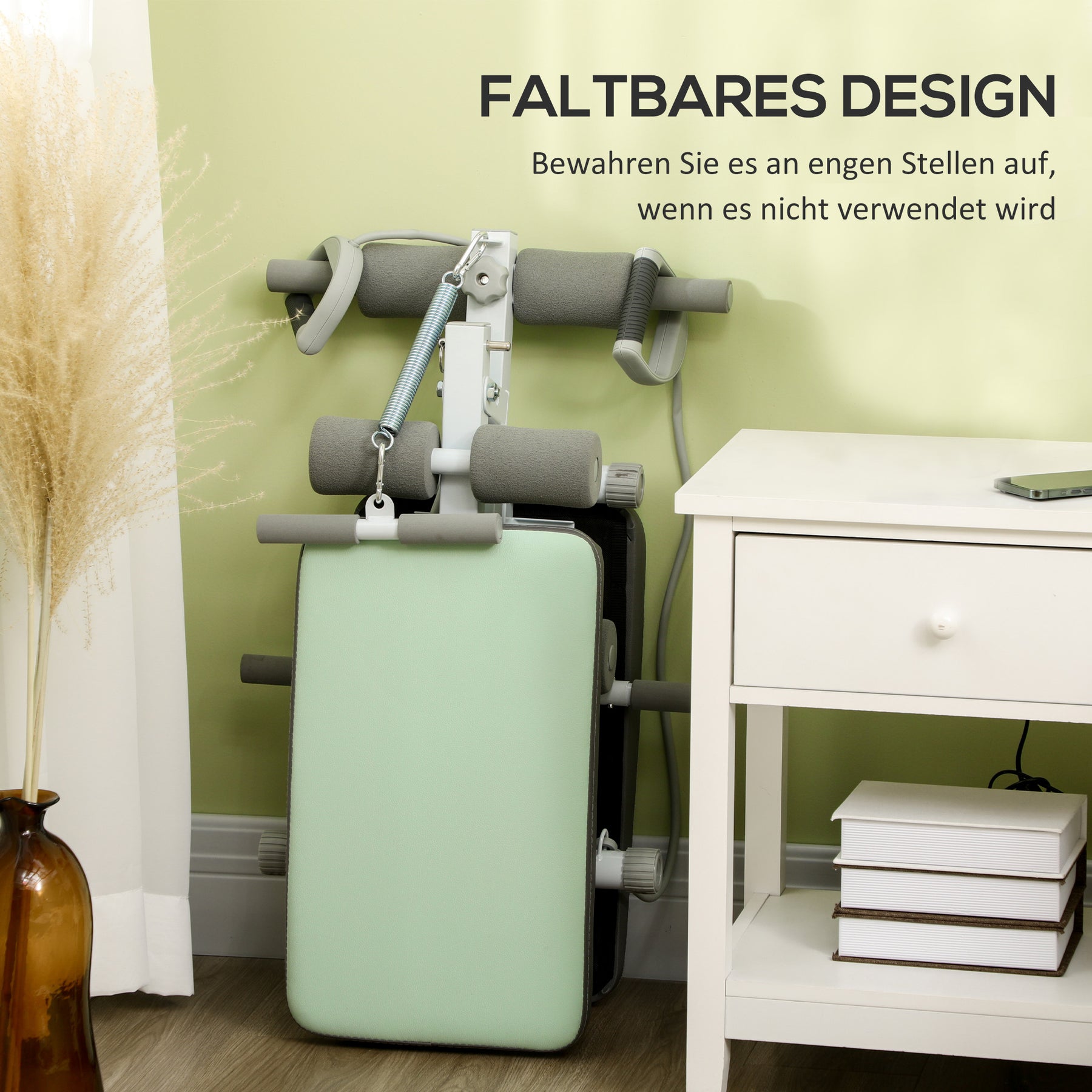 Træningsbænk, mavetræner, højdejusterbar, foldbar, 2 elastikker, stål, grøn, 51 x 137 x 50-66 cm