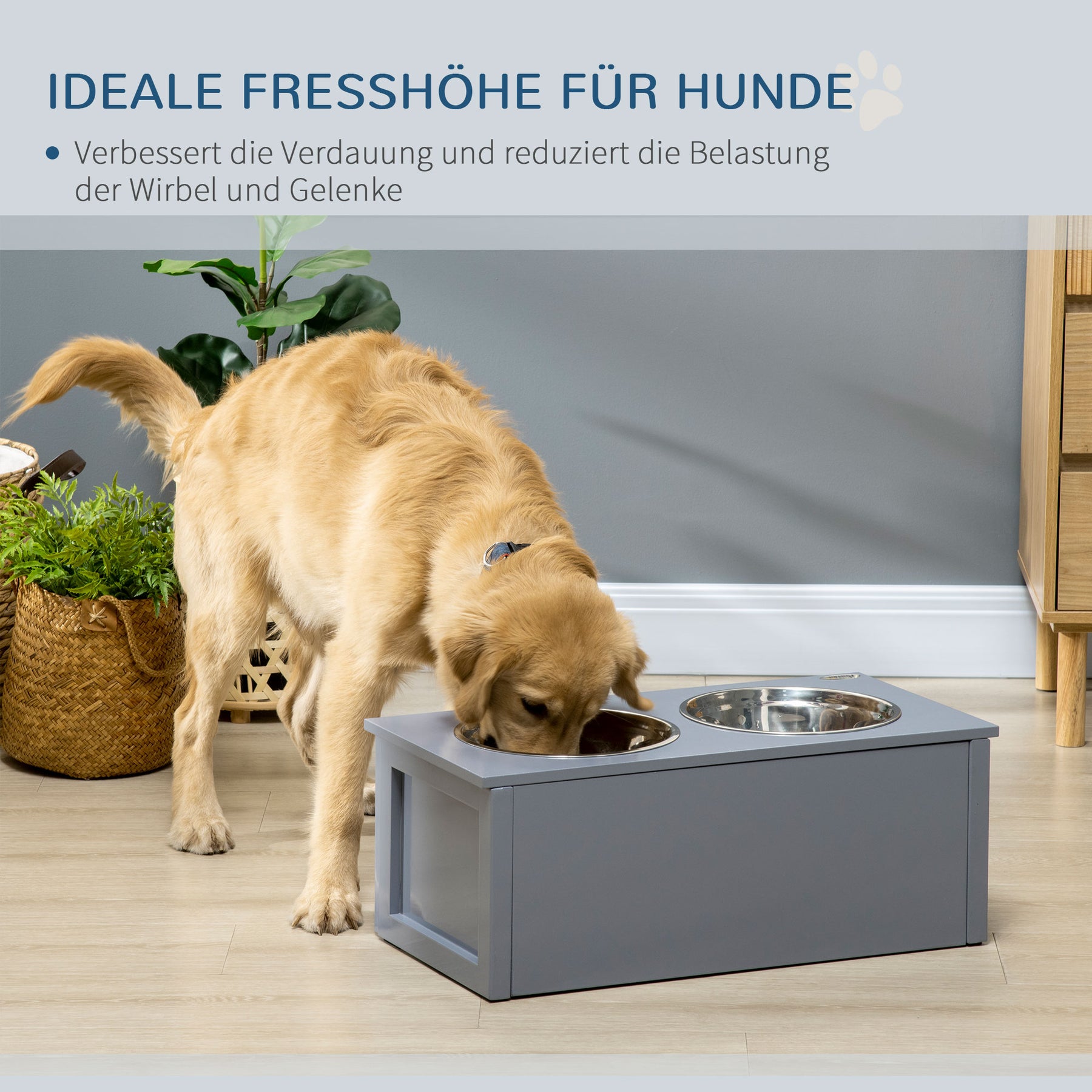 Foderstation, 2 2-liters skåle, rustfrit stål, med skuffe, til mellemstore hunde, grå, 60 x 30 x 24 cm