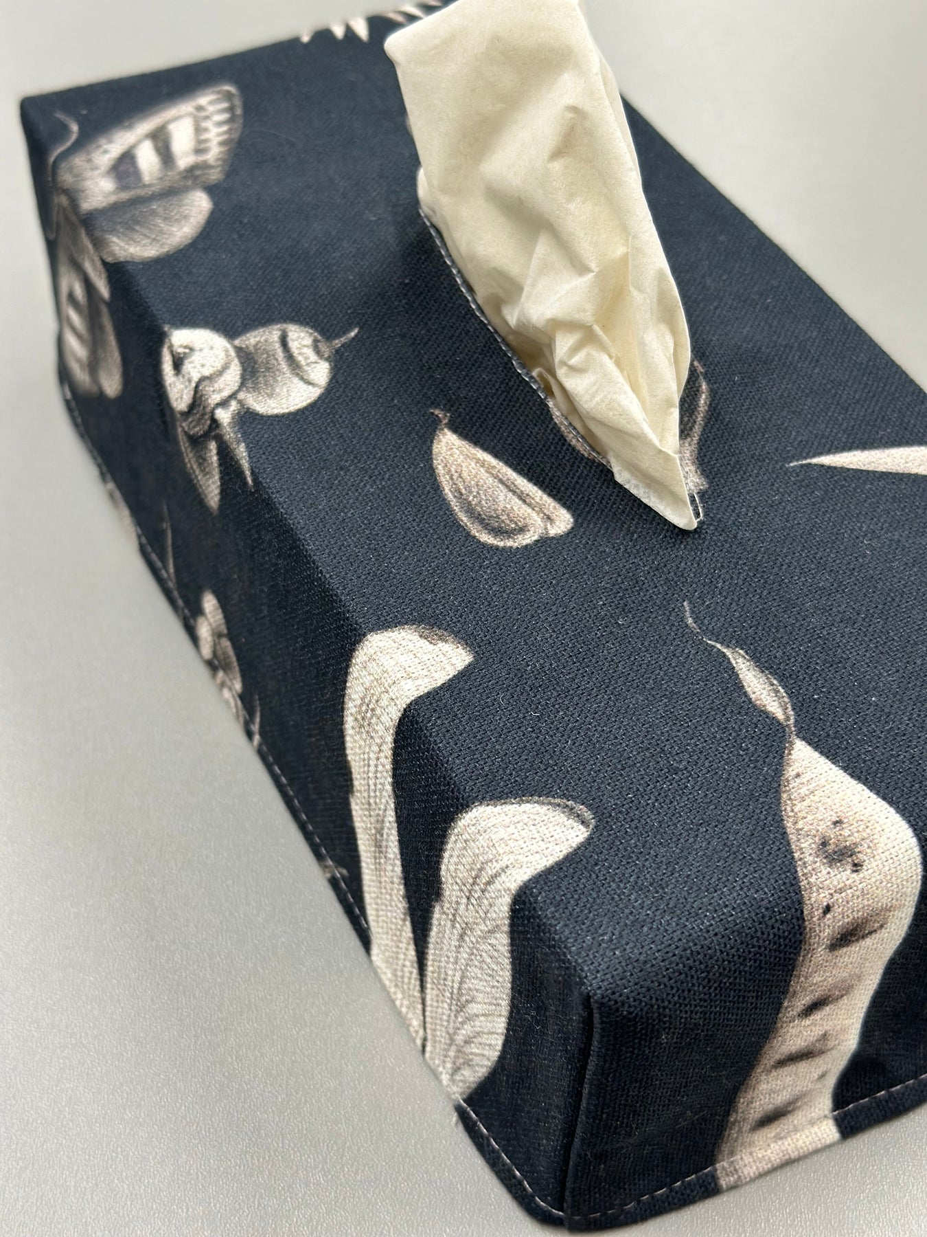 Bring naturens skønhed ind i dit hjem med vores charmerende tekstiler. Vores servietboks-betræk i 100% bomuld har en elegant sort baggrund med et delikat print af guldsmede og artiskokker. Det er den perfekte måde at tilføje et sofistikeret og overraskende element til ethvert rum og imponere dine gæster.