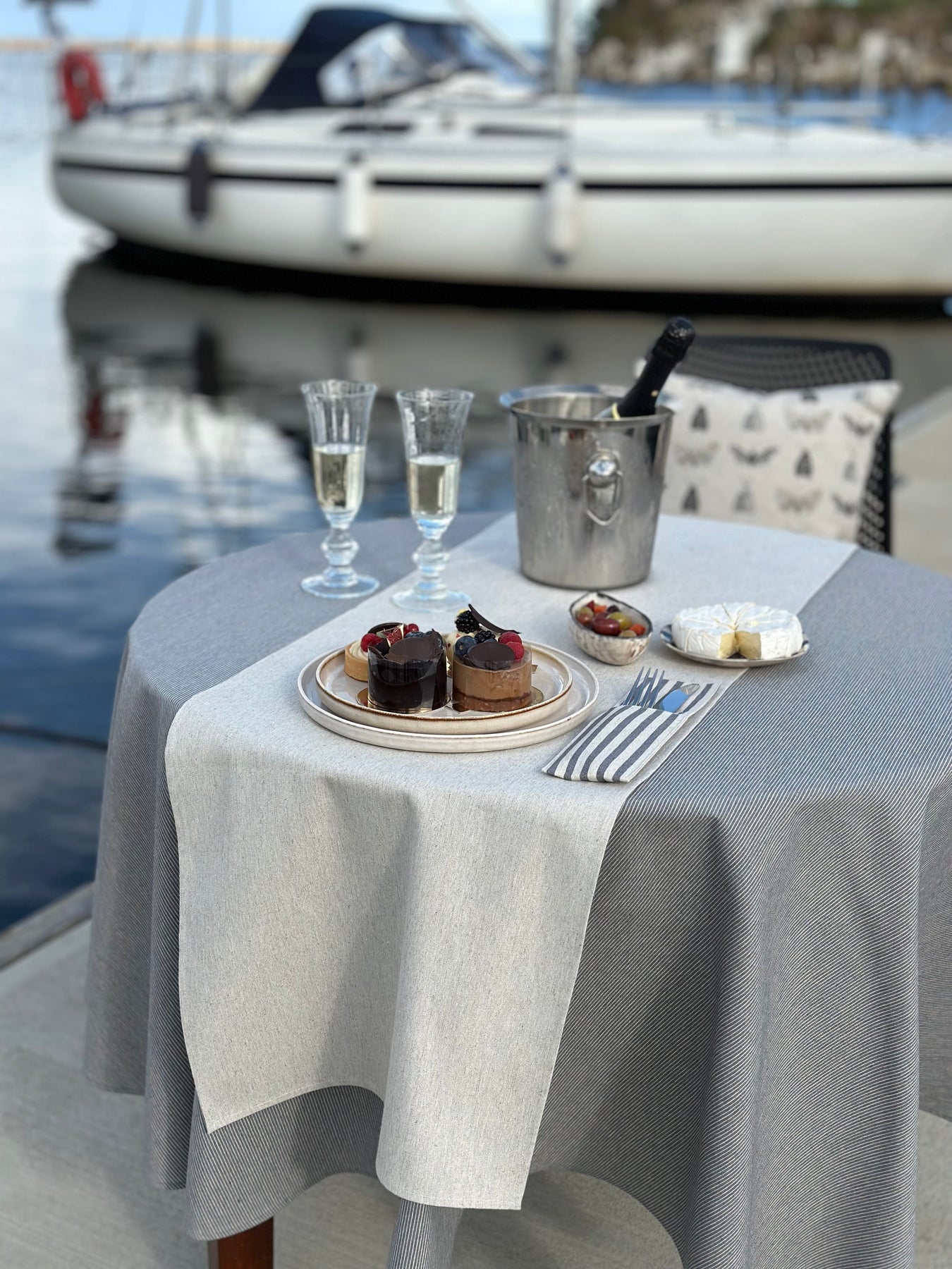 Forvandl dit spisebord med denne alsidige og miljøbevidste dug fra vores Nord-kollektion. Den er fremstillet af genanvendt stof og kombinerer elegant design med en forpligtelse til bæredygtighed. Med sine neutrale farver, fremhævet af fine blå striber og nordisk charme, passer den perfekt ind i ethvert hjem og bringer et friskt pust til din spiseplads.