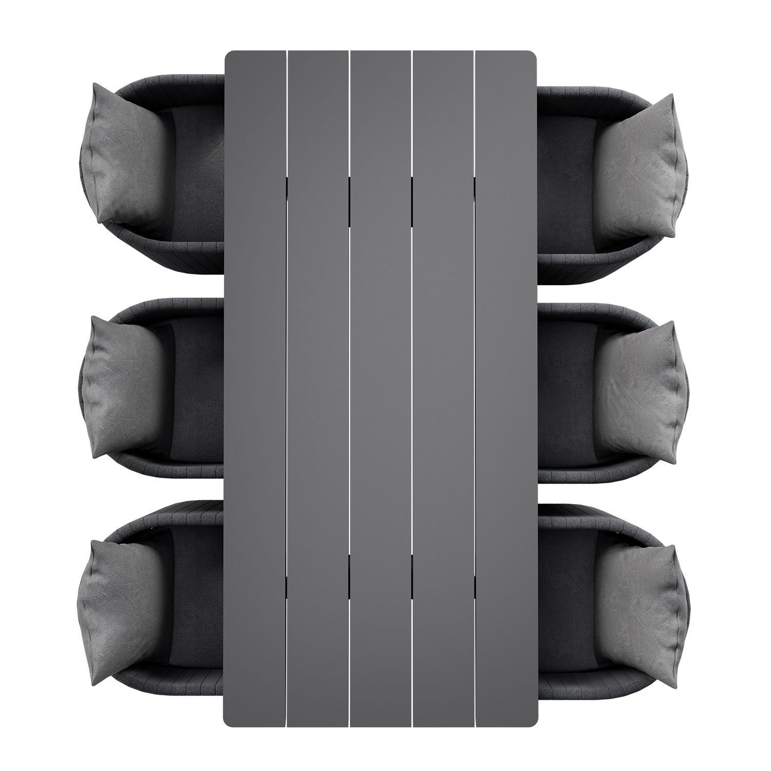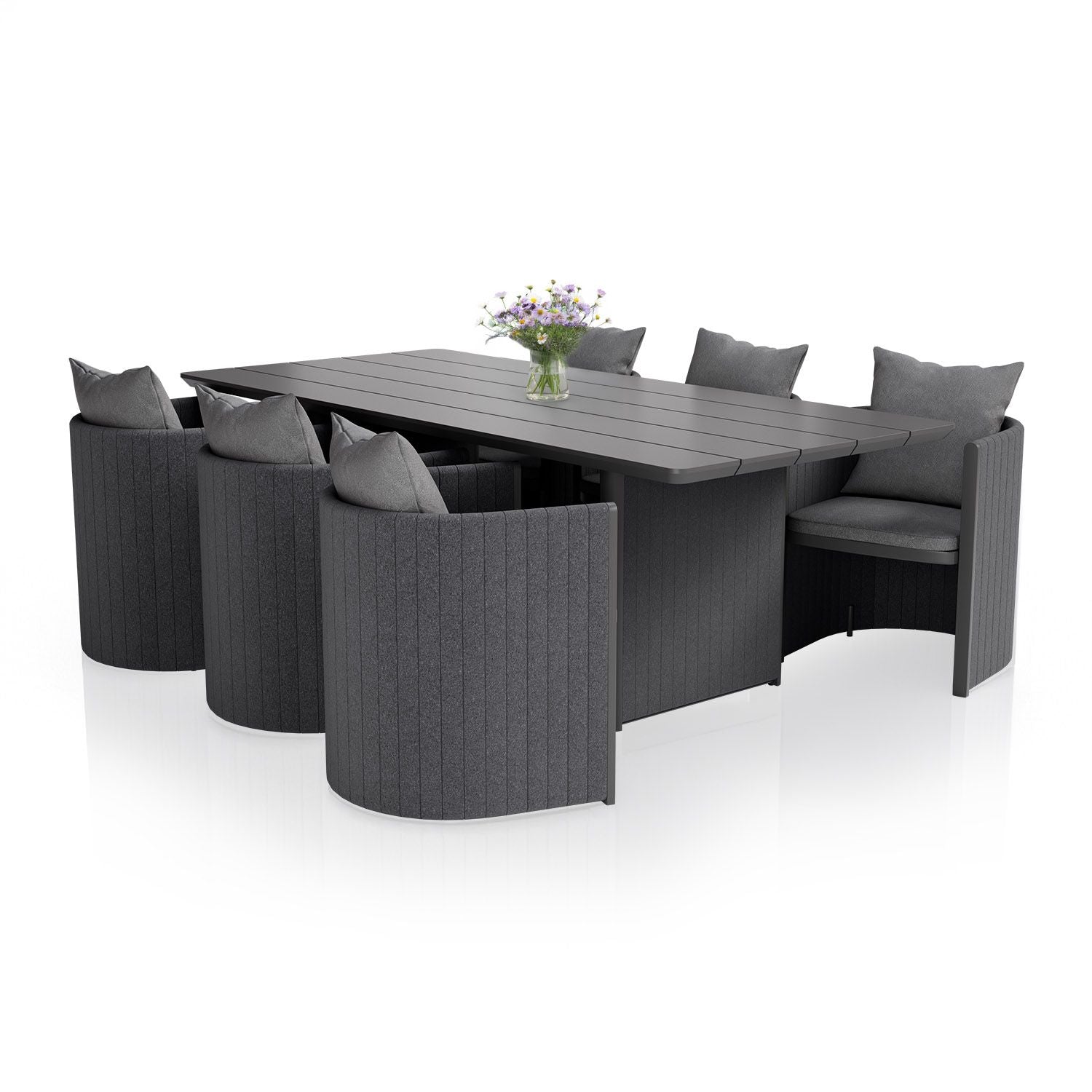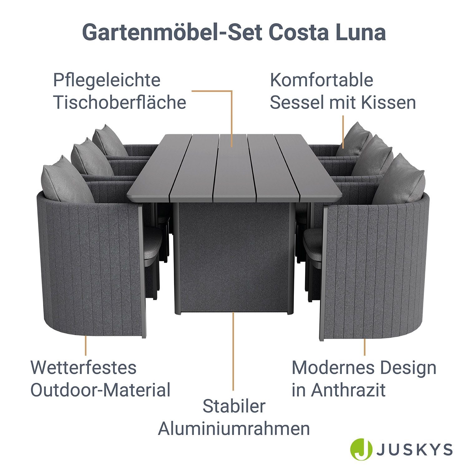 Costa Luna Havemøbelsæt til 6 personer kombinerer moderne, stilrent design med uovertrufne vejrbestandige materialer. Takket være det pulverlakerede aluminiumsstel, vandafvisende hynder og en vedligeholdelsesfri bordplade er dette sæt ideelt til terrassen, altanen eller udestuen – uanset vejret.