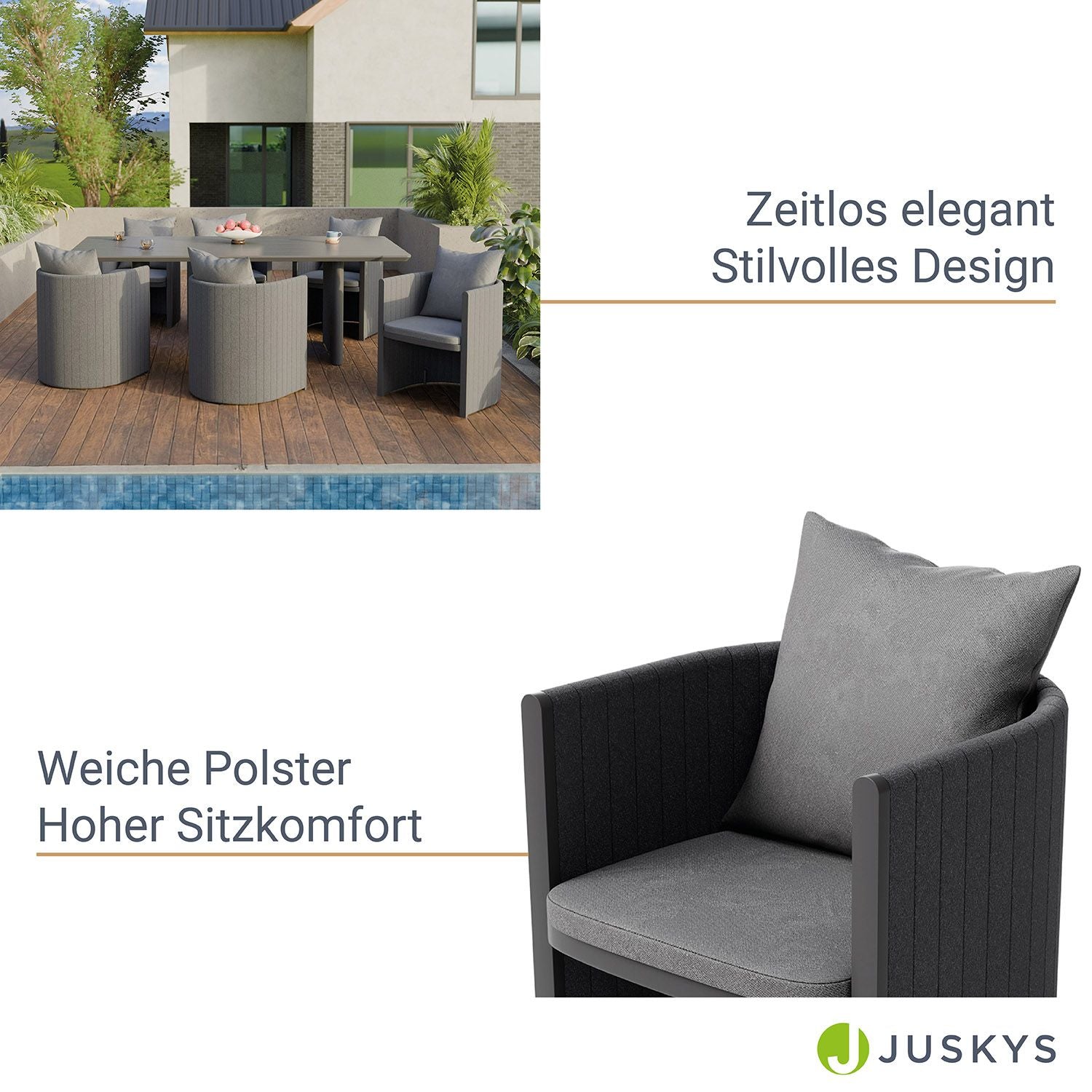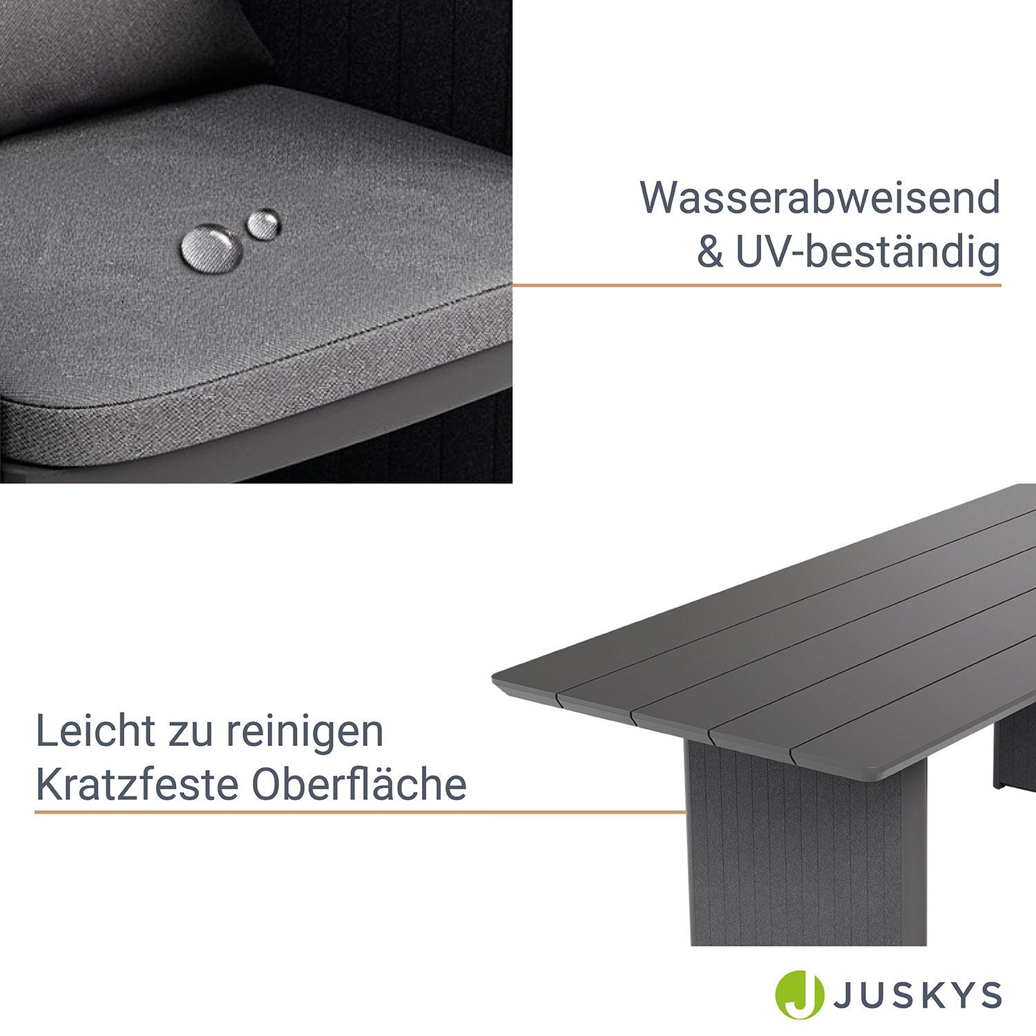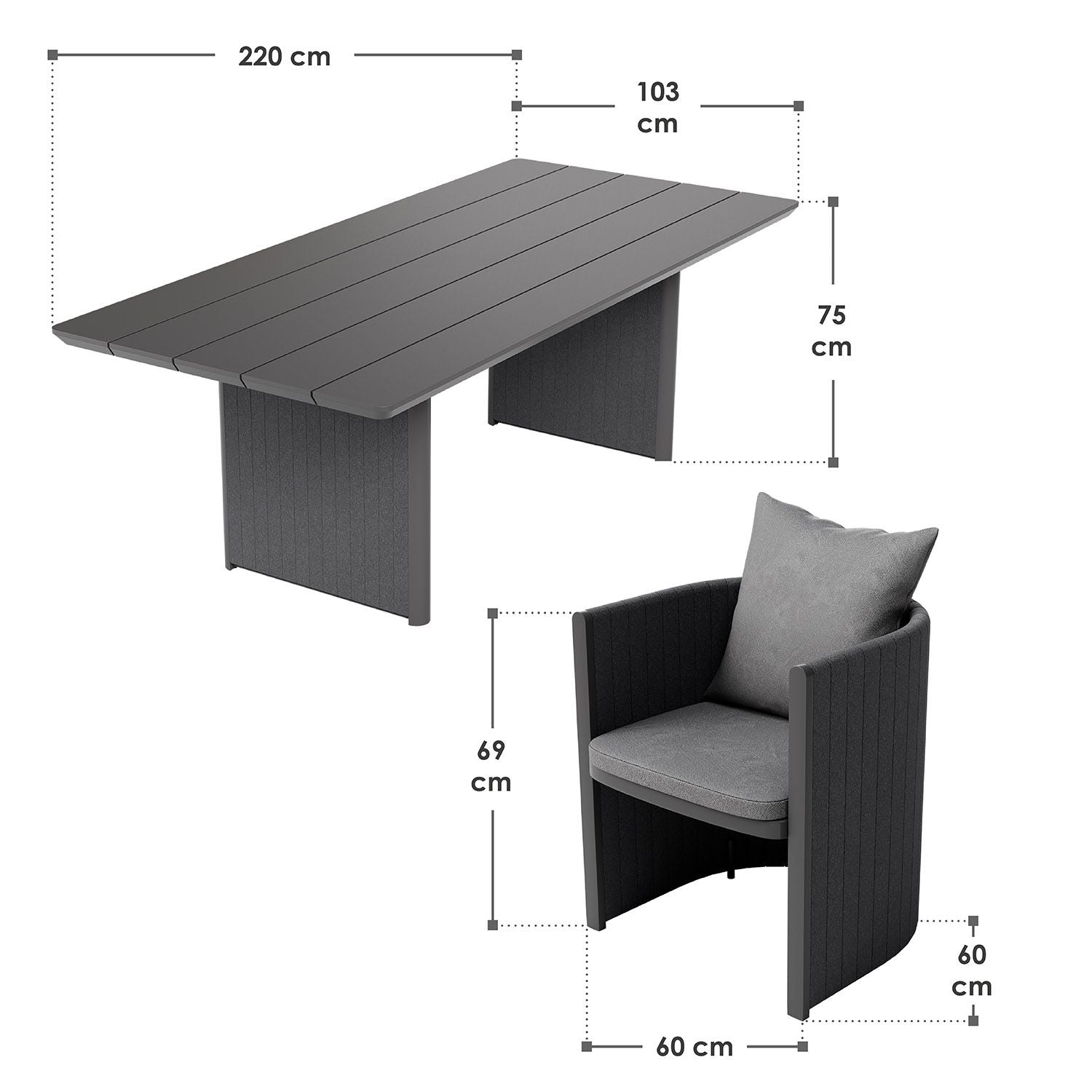 Costa Luna Havemøbelsæt til 6 personer kombinerer moderne, stilrent design med uovertrufne vejrbestandige materialer. Takket være det pulverlakerede aluminiumsstel, vandafvisende hynder og en vedligeholdelsesfri bordplade er dette sæt ideelt til terrassen, altanen eller udestuen – uanset vejret.