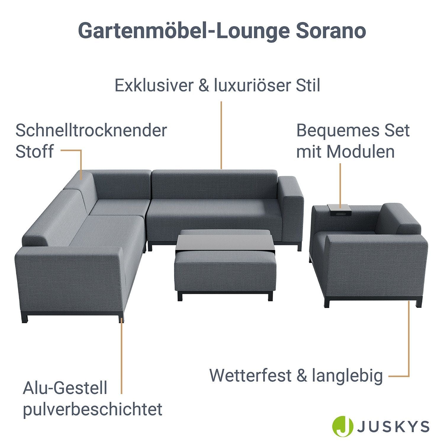 Det højklassede Loungesæt Sorano kombinerer et elegant design med suveræn funktionalitet. Sættet er fremstillet af holdbare materialer, der sikrer lang levetid og høj komfort. Takket være det pulverlakerede aluminiumsstel er loungen yderst stabil og vejrbestandig. Selv en lille regnbyge er intet problem takket være det hurtigtørrende skum. De rene linjer og det tidløse design passer perfekt ind i et eksklusivt udemiljø. Gør dig klar til at forvandle dit uderum til en stilfuld oase af afslapning.