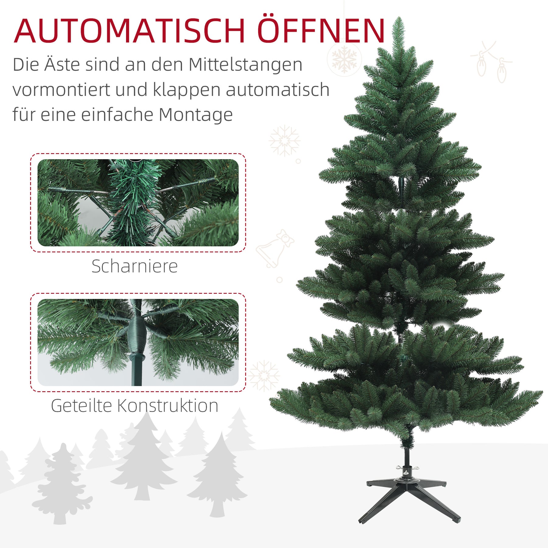 Fejr jul med et naturtro juletræ af nordmannsgran, der forbliver grønt året rundt uden behov for vand eller gødning. Takket være det praktiske design er det en leg at sætte træet op, så du kan tilbringe mere tid med dine kære. Sikkerhed er vores højeste prioritet: De flammehæmmende grene og den robuste stålfod sikrer en ubekymret fest.