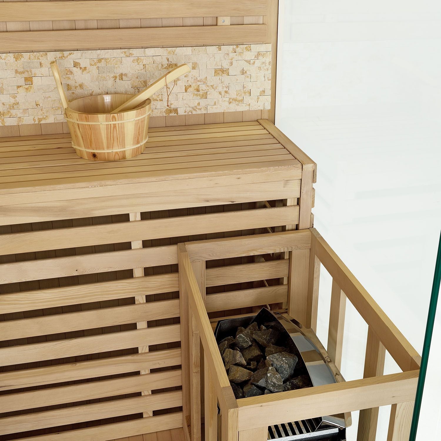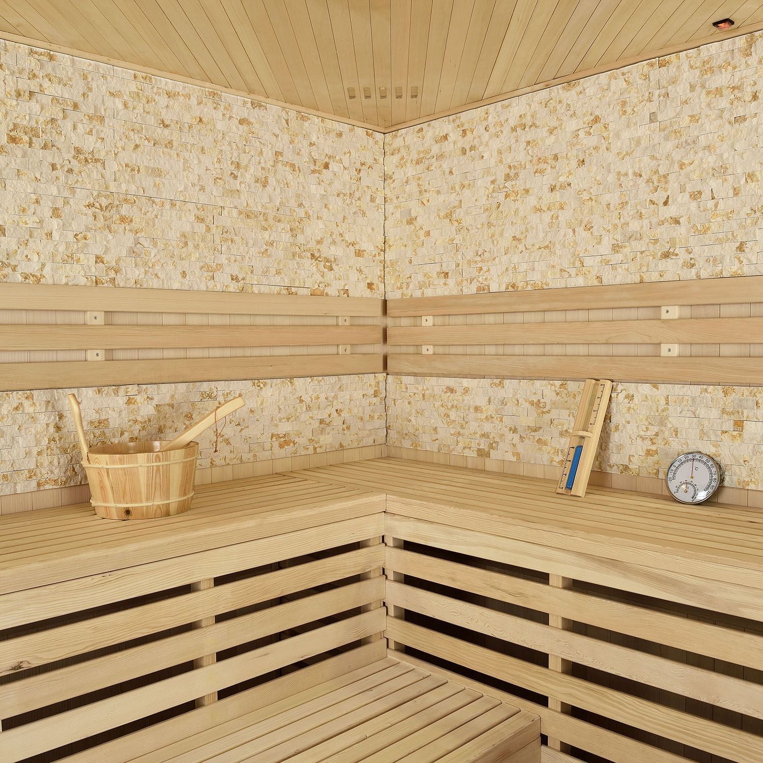 Med Hjørne-Saunakabine Espoo200 Premium med Naturstensvæg bringer du den sunde virkning af et saunabad direkte hjem. Nu kan du tage sauna, når du vil, og svede dig sund i afslappende og luksuriøse omgivelser.