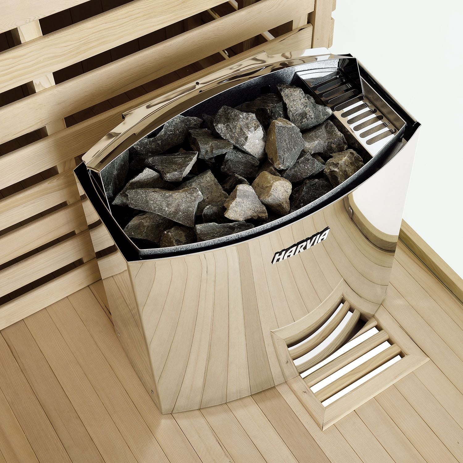 Effektiv Varme: Den moderne saunaovn fra den finske producent Harvia sørger med sine 8 kW for en velgørende varme. Ovnen styres nemt med to betjeningsknapper. Det elegante yderkabinettet i rustfrit stål med trælister giver saunaen et stilfuldt design.