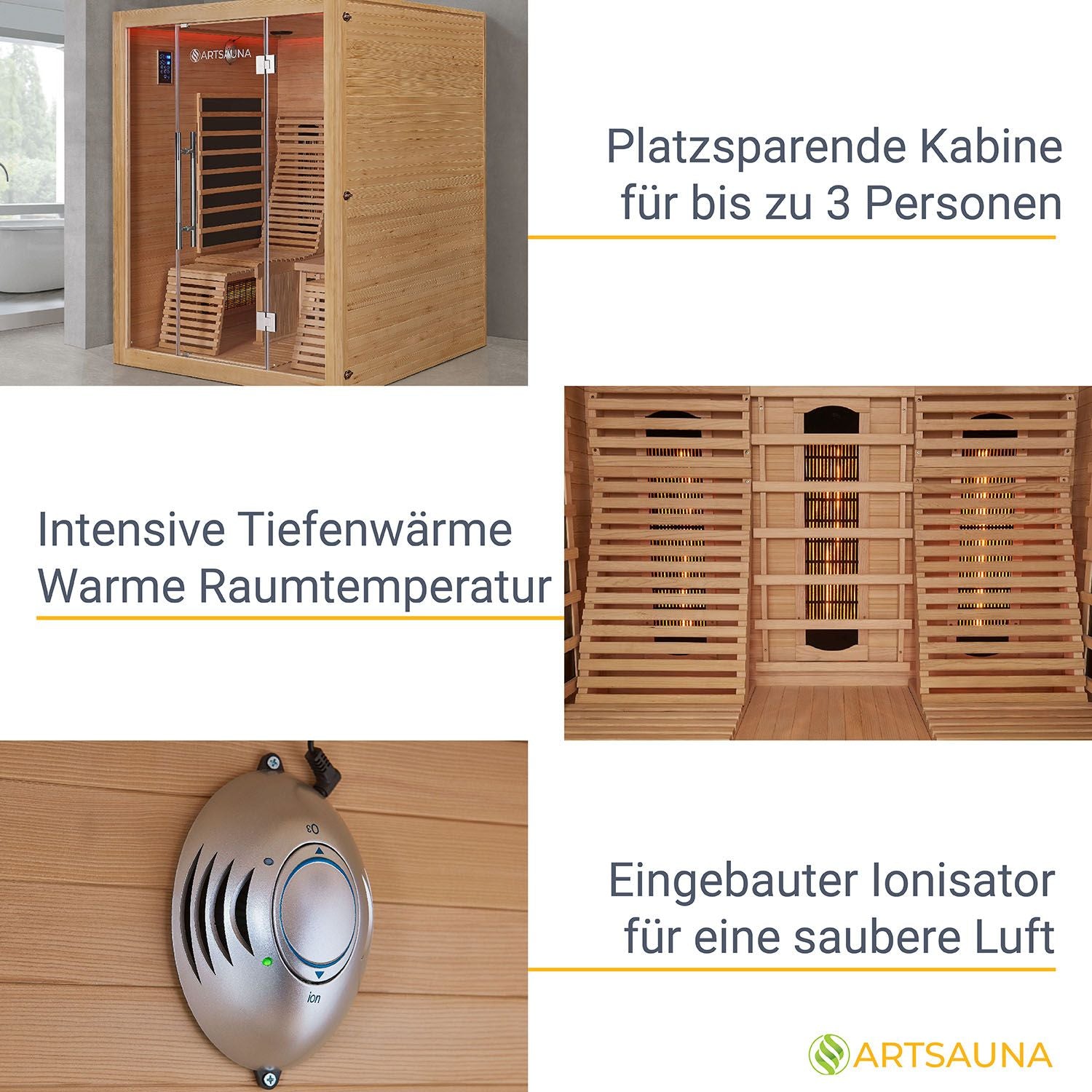 • Effektiv Rensning: Den indbyggede ionisator fungerer som en luftrenser, der med sine negativt ladede ioner renser luften i din infrarødkabine. Lugte, støv, kim og skimmelsvamp fjernes pålideligt fra luften.