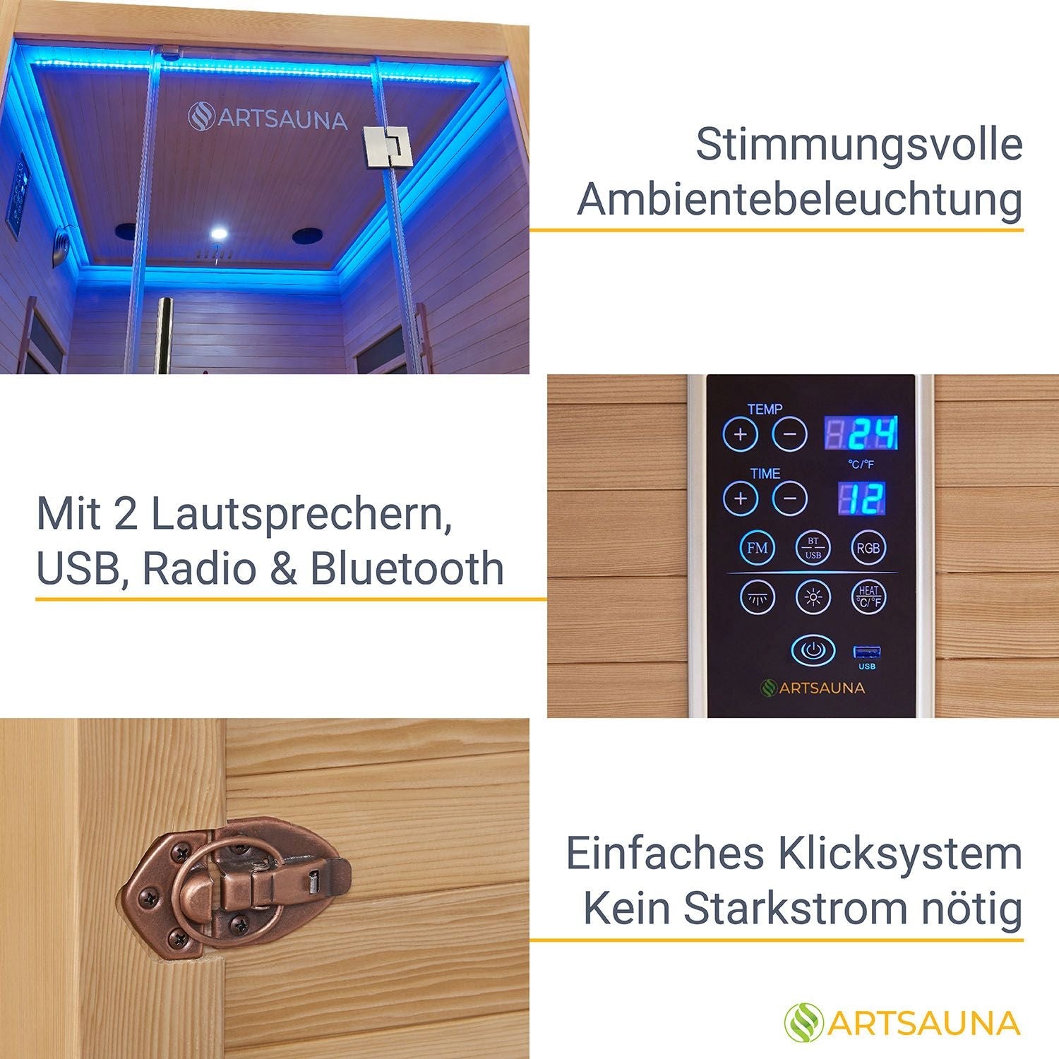 • Underholdning: Infrarødsaunaen er udstyret med et moderne HiFi-system med 2 stereo-højttalere. Læn dig tilbage og lyt til din yndlingsmusik. Kabinen har USB-tilslutning og Bluetooth.
