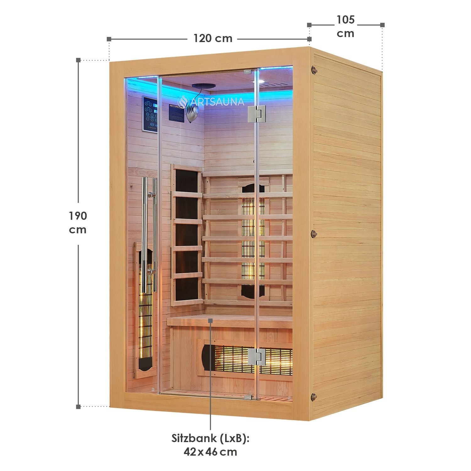 Kompakte Mål: Med et grundmål på 120 x 105 cm er infrarødkabinen en pladsbesparende løsning, der passer perfekt ind i dit hjem.