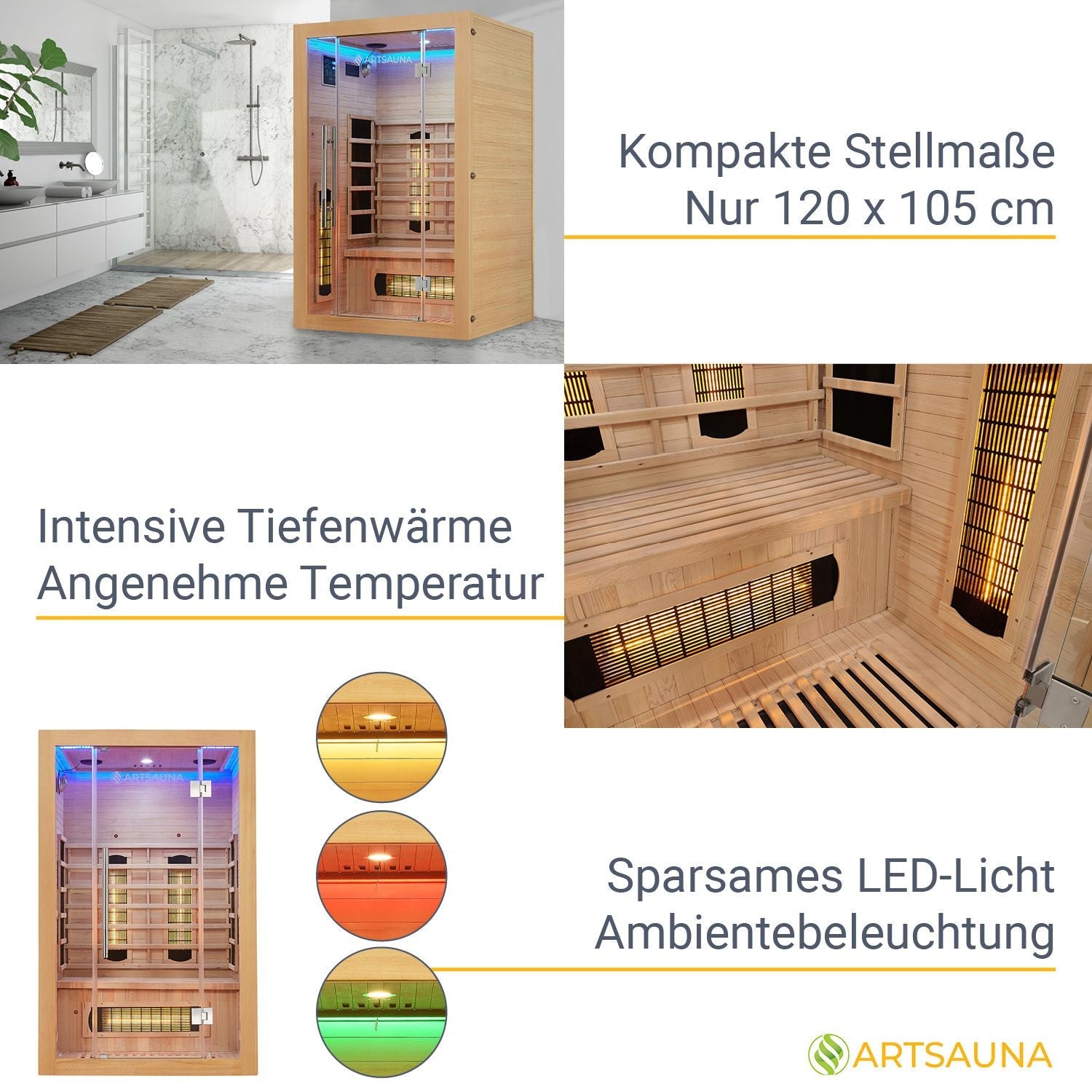 Total Stemning: Et særligt højdepunkt er LED-lyset, der omkranser hele kabinens loft. Den stemningsfulde ombientbelysning kaster et indirekte farvelys ind i varmekabinen og skaber den perfekte atmosfære.