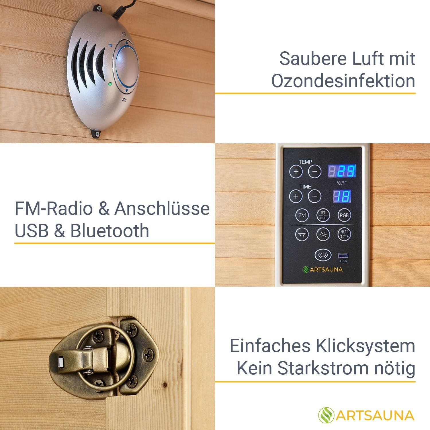 Underholdning: Infrarødsaunaen er udstyret med et moderne radio med to højttalere. Læn dig tilbage og lyt til din yndlingsmusik. Radioen har FM-radio, Bluetooth-funktion og tilslutninger til USB-lagermedier.