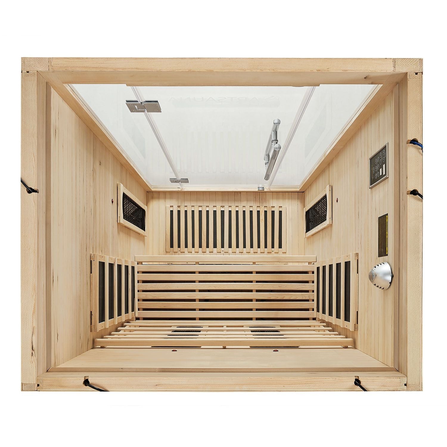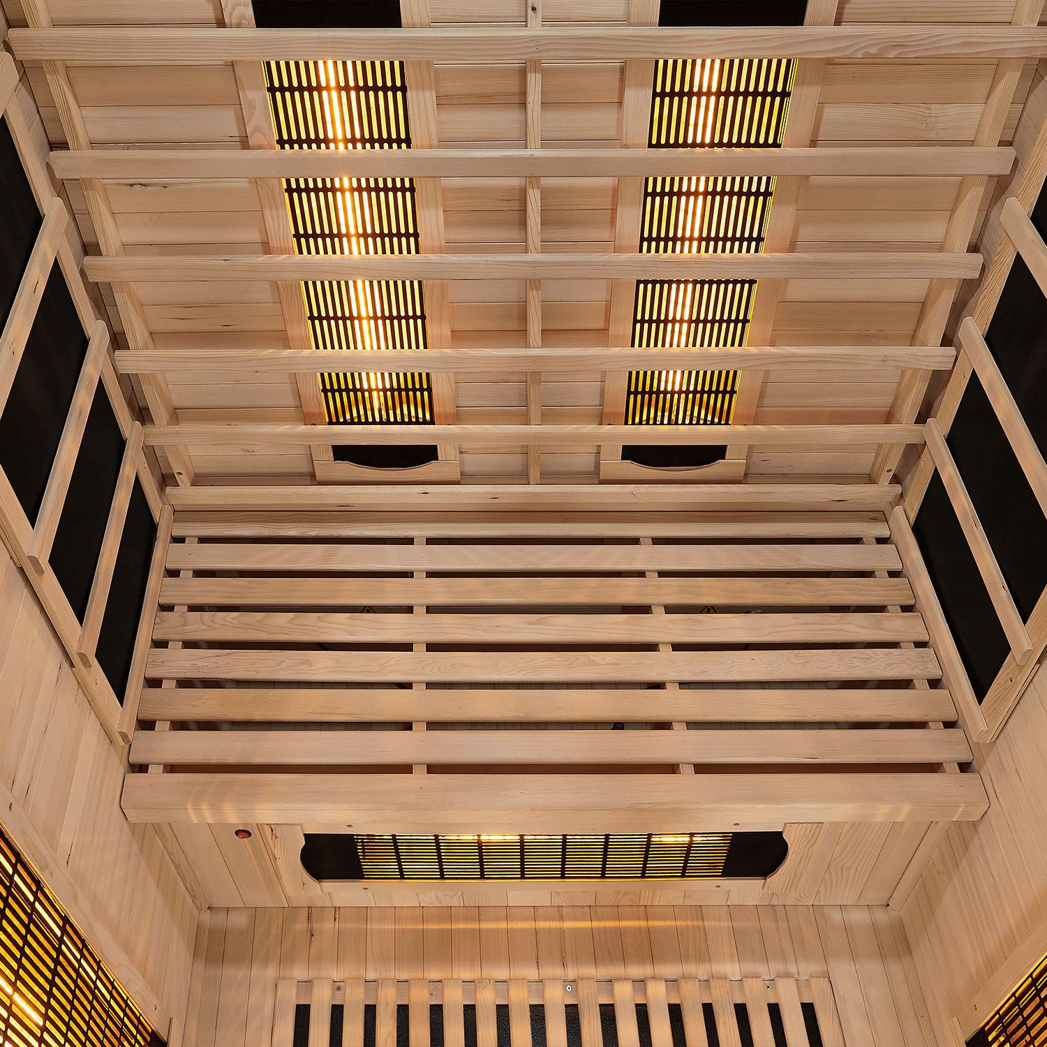 Ideelt Rumklima: Vi bruger det lyse træ fra Hemlock-gran, der reflekterer den varme infrarødstråling og holder den inde i kabinen. Sammen med træets vandafvisende egenskab skabes et behageligt rumklima.