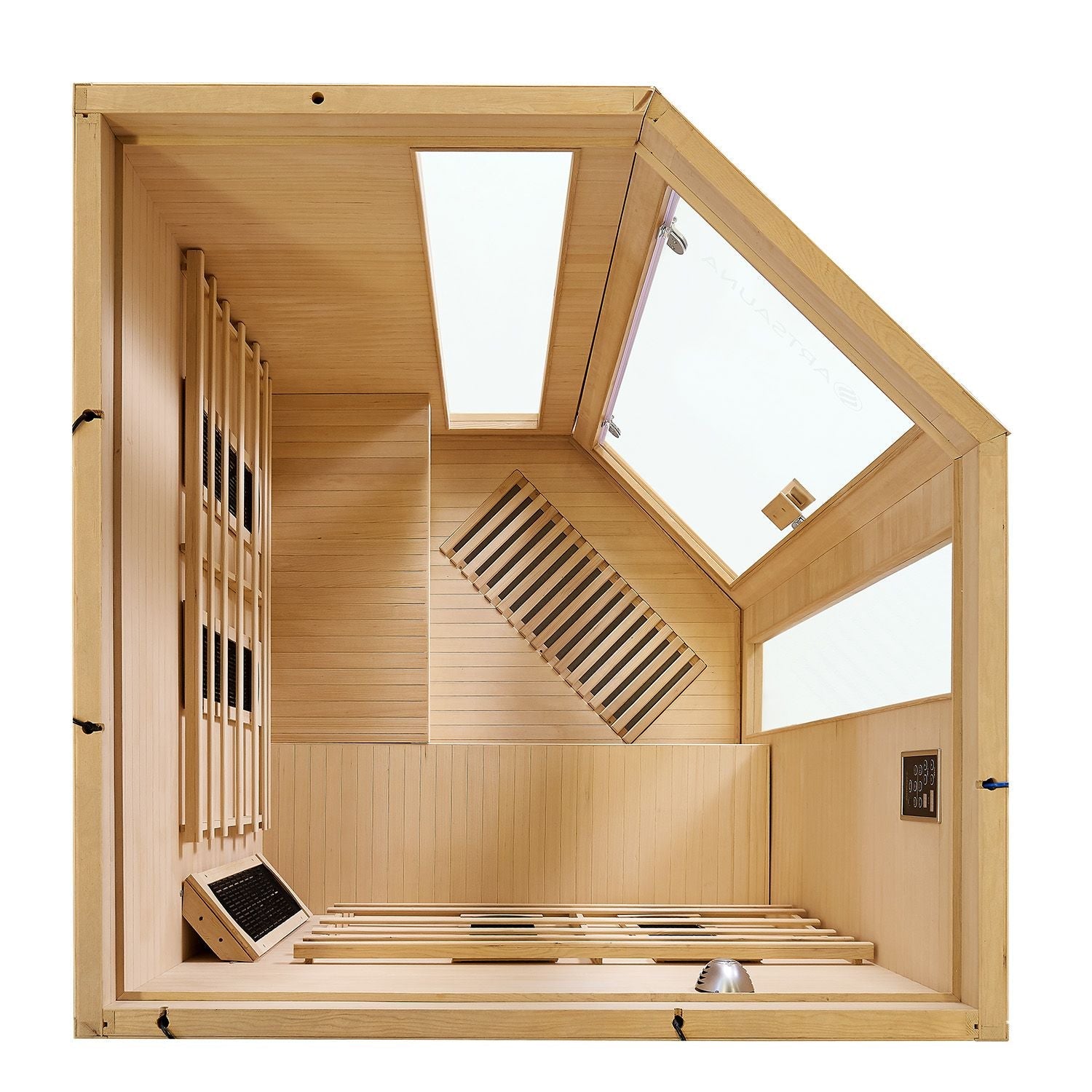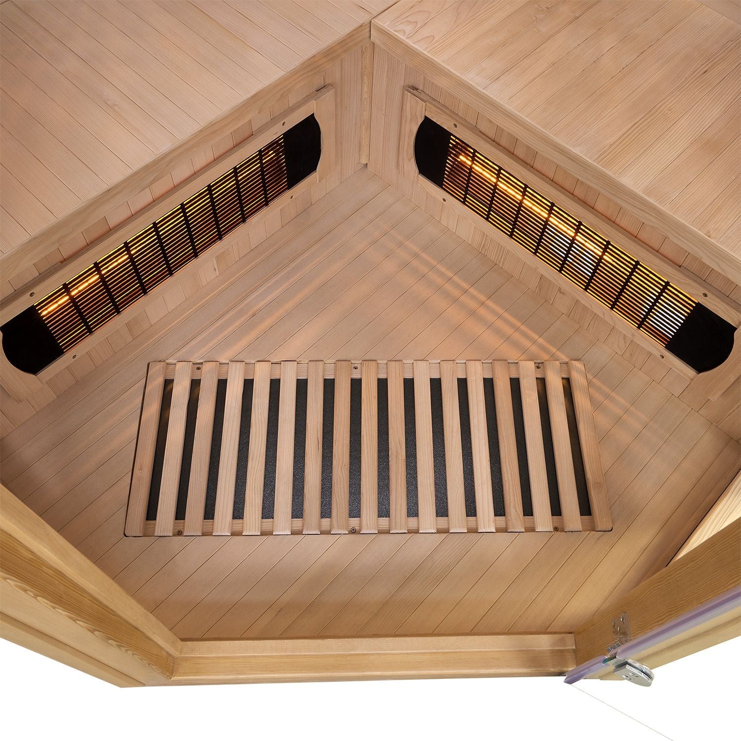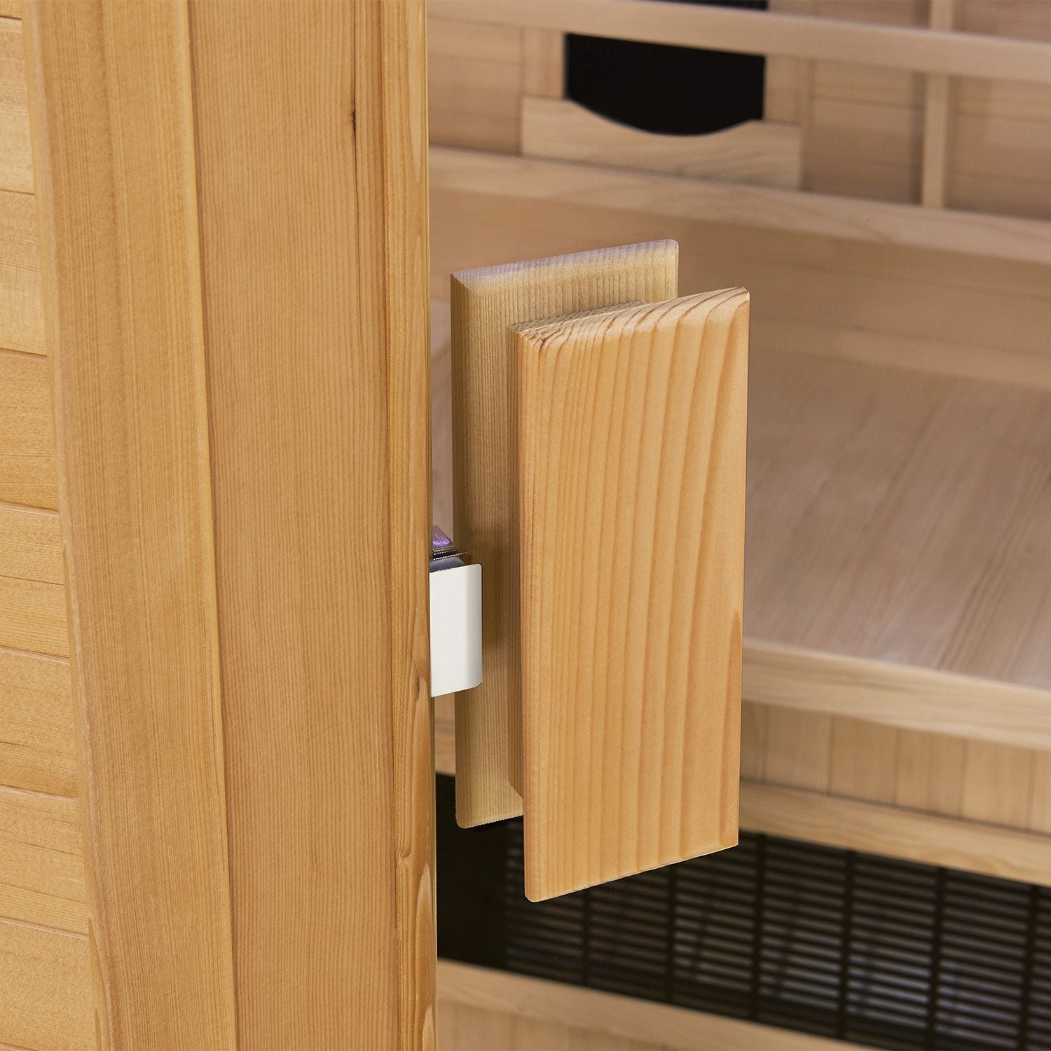 Ideelt Rumklima: Vi bruger det lyse træ fra Hemlock-gran til vores infrarødkabiner. Den specielle træsort reflekterer den varme infrarødstråling og holder den inde i kabinen. Sammen med granens vandafvisende egenskab skaber dette et behageligt rumklima.