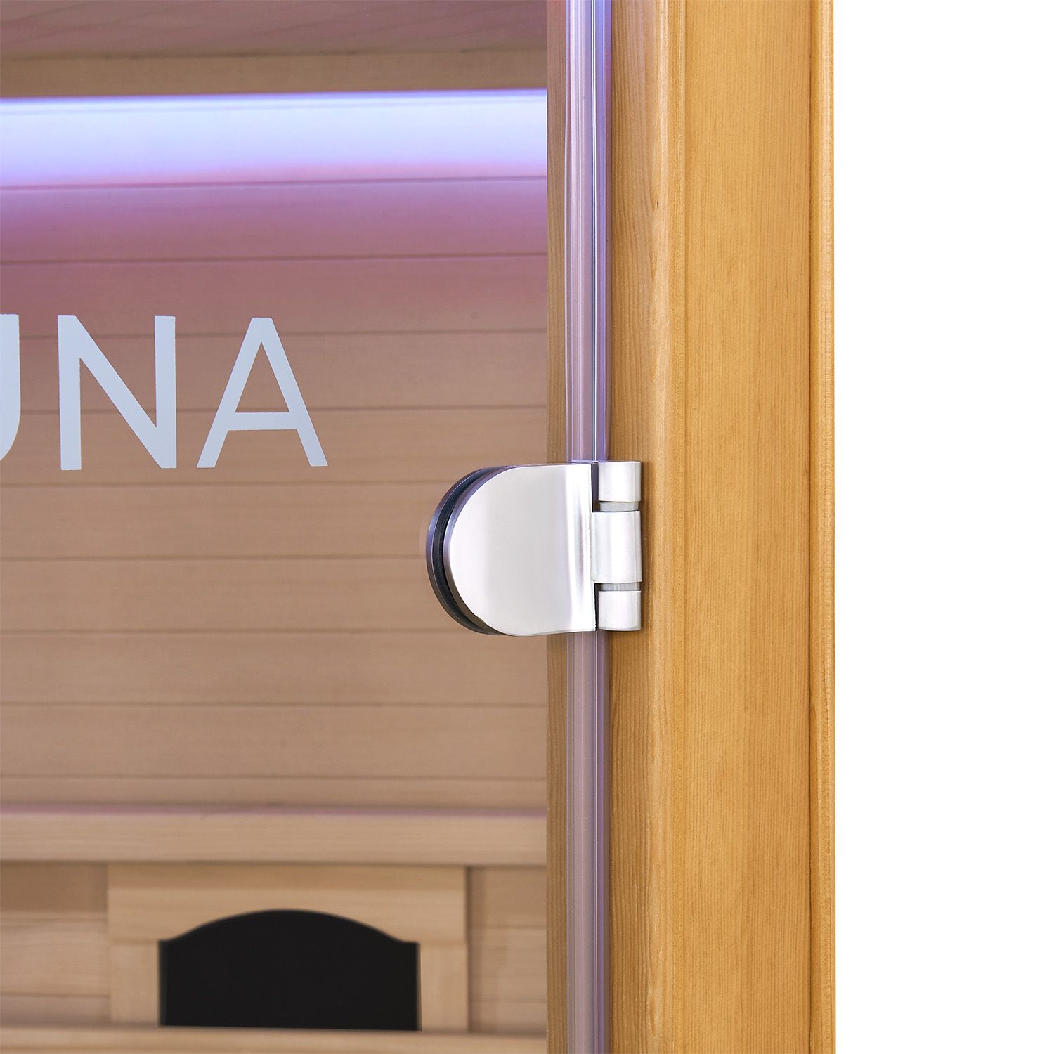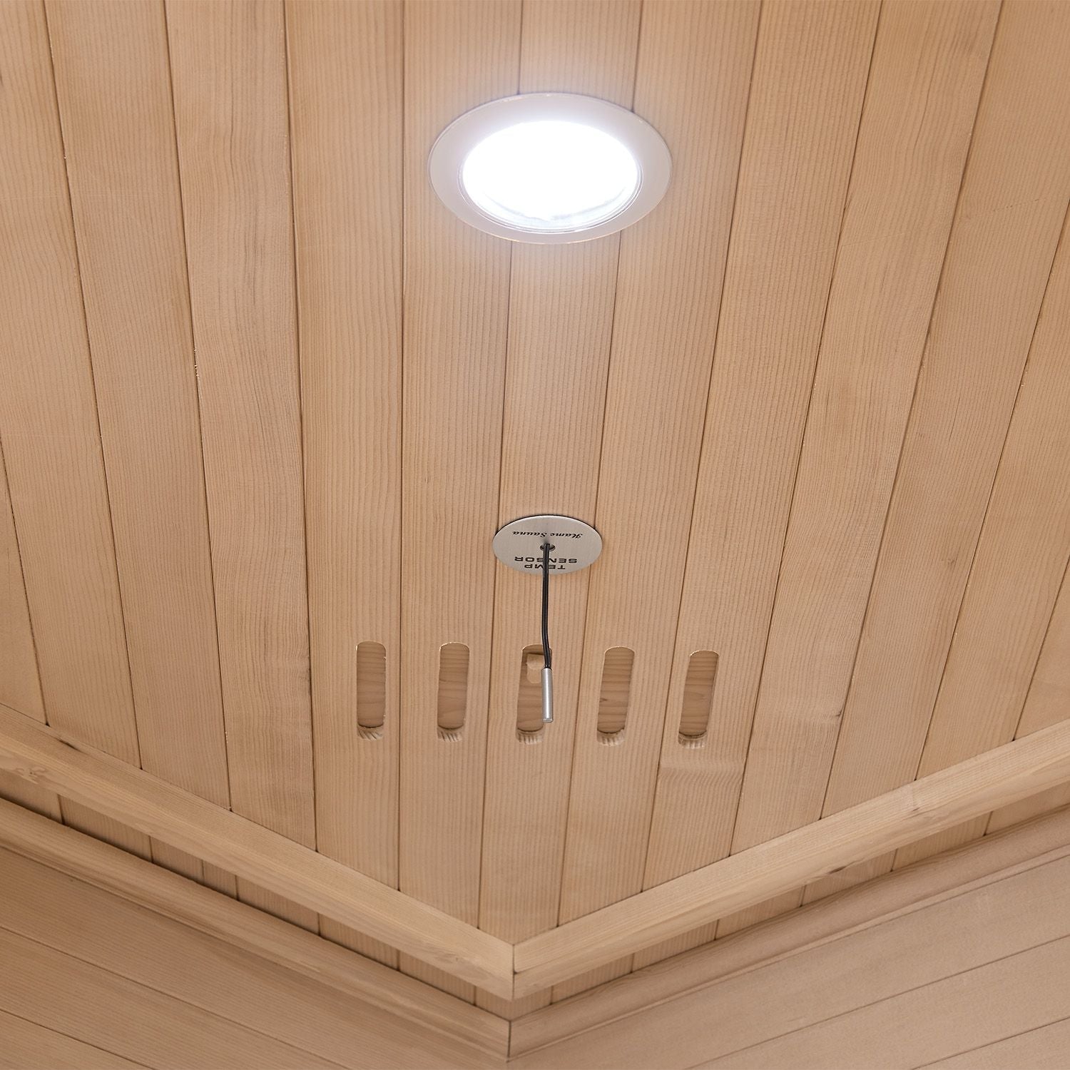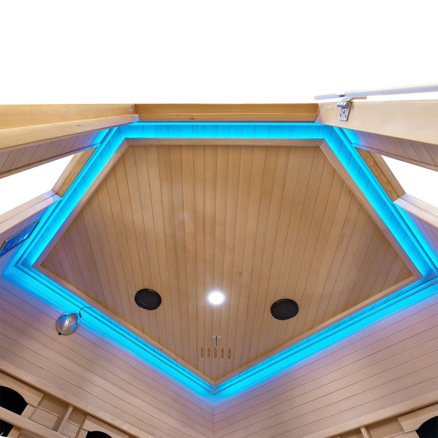 Total Stemning: Et særligt højdepunkt er LED-lyset, der omkranser hele kabinens loft. Den stemningsfulde ombientbelysning kaster et indirekte farvelys ind i varmekabinen og skaber den perfekte atmosfære til velvære.