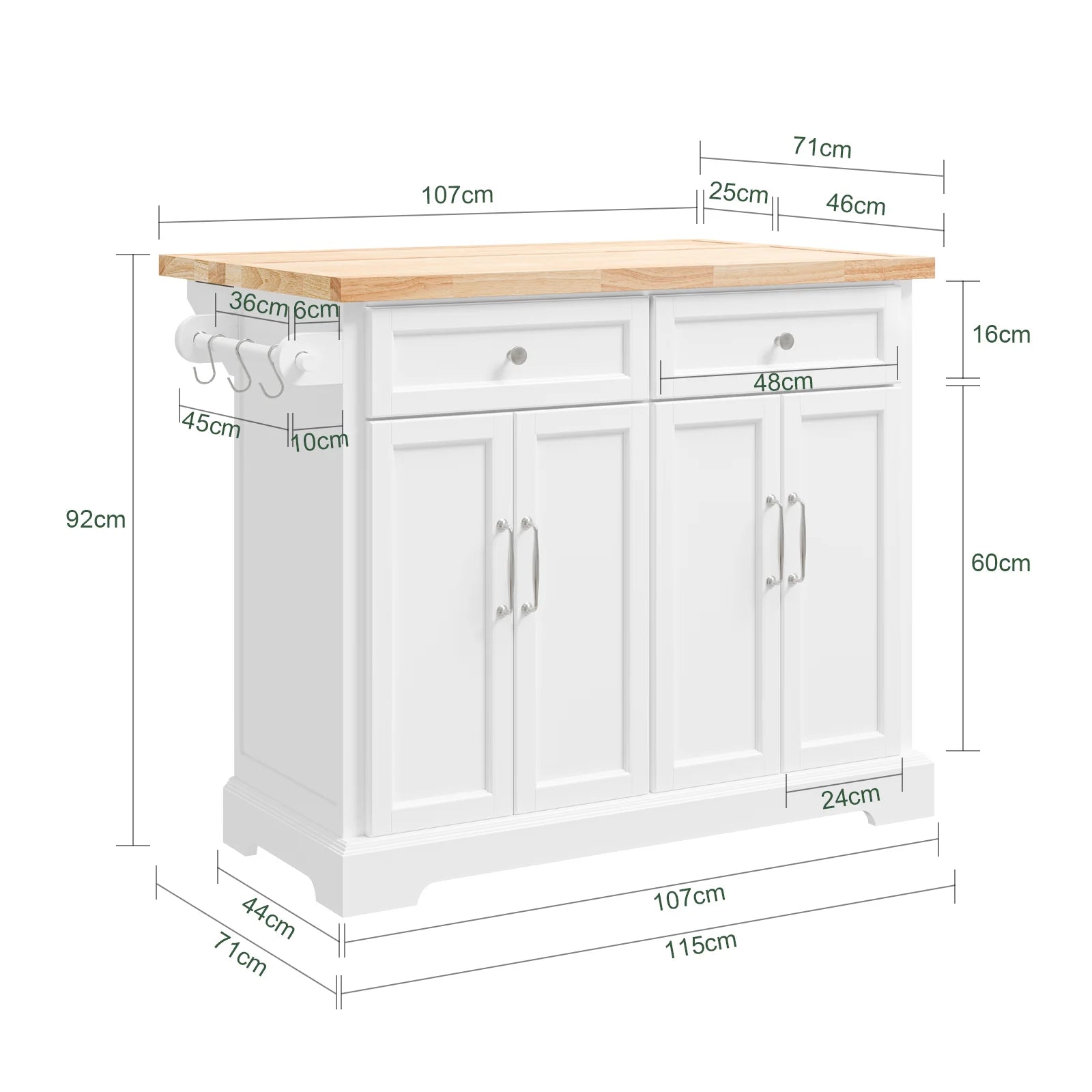 Rummeligt indre: Køkkenøen er udstyret med 2 letløbende skuffer og 2 skabe med dobbeltdøre og justerbare hylder. Skab fleksible opbevaringsløsninger til alle dine køkkenting.