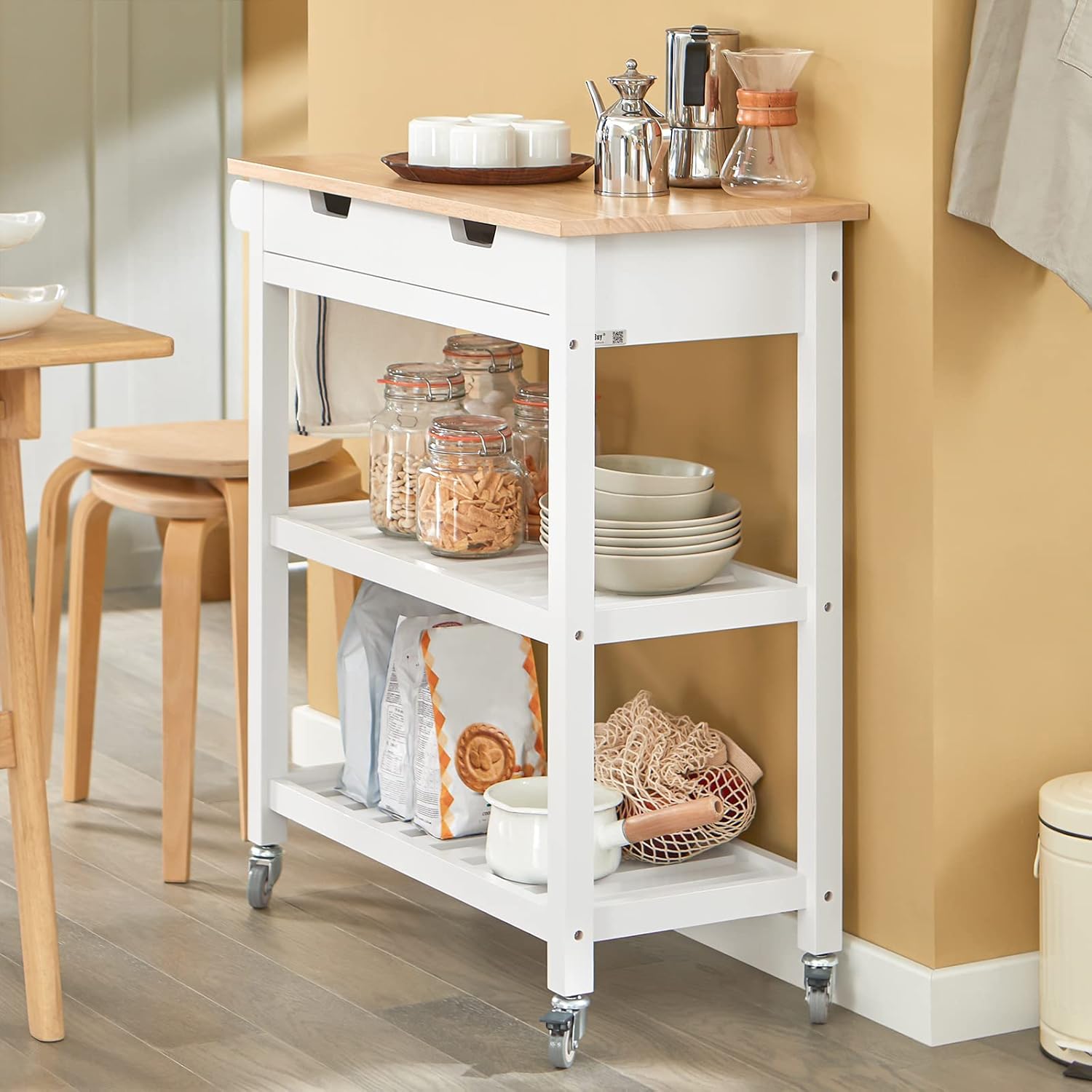 Den holdbare bordplade i massivt gummitræ og stellet i fyrretræ og MDF med hvid lakering, giver et tidløst og elegant look. Med fire robuste drejehjul, hvoraf to har bremser, kan du nemt flytte vognen rundt i køkkenet eller låse den sikkert på plads.