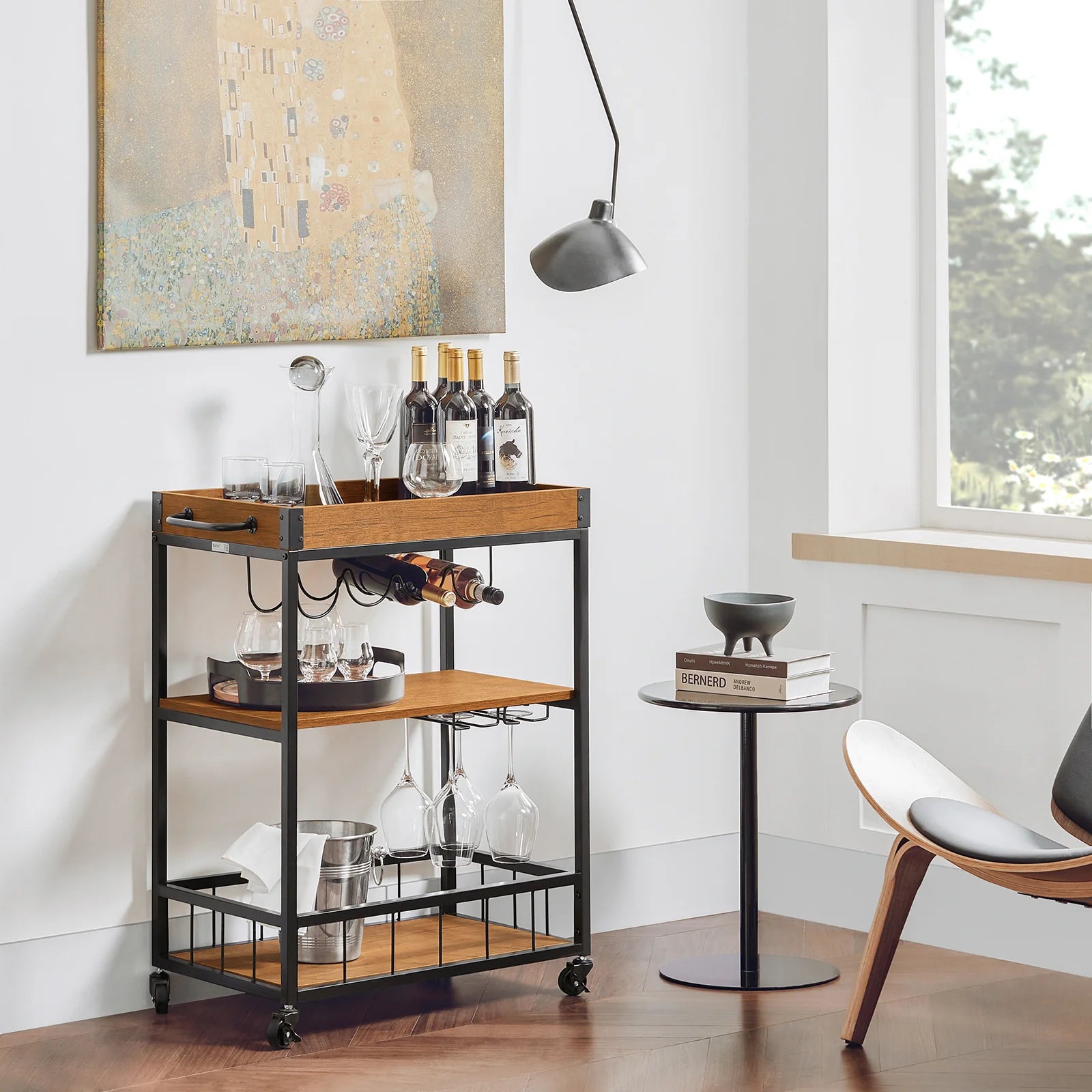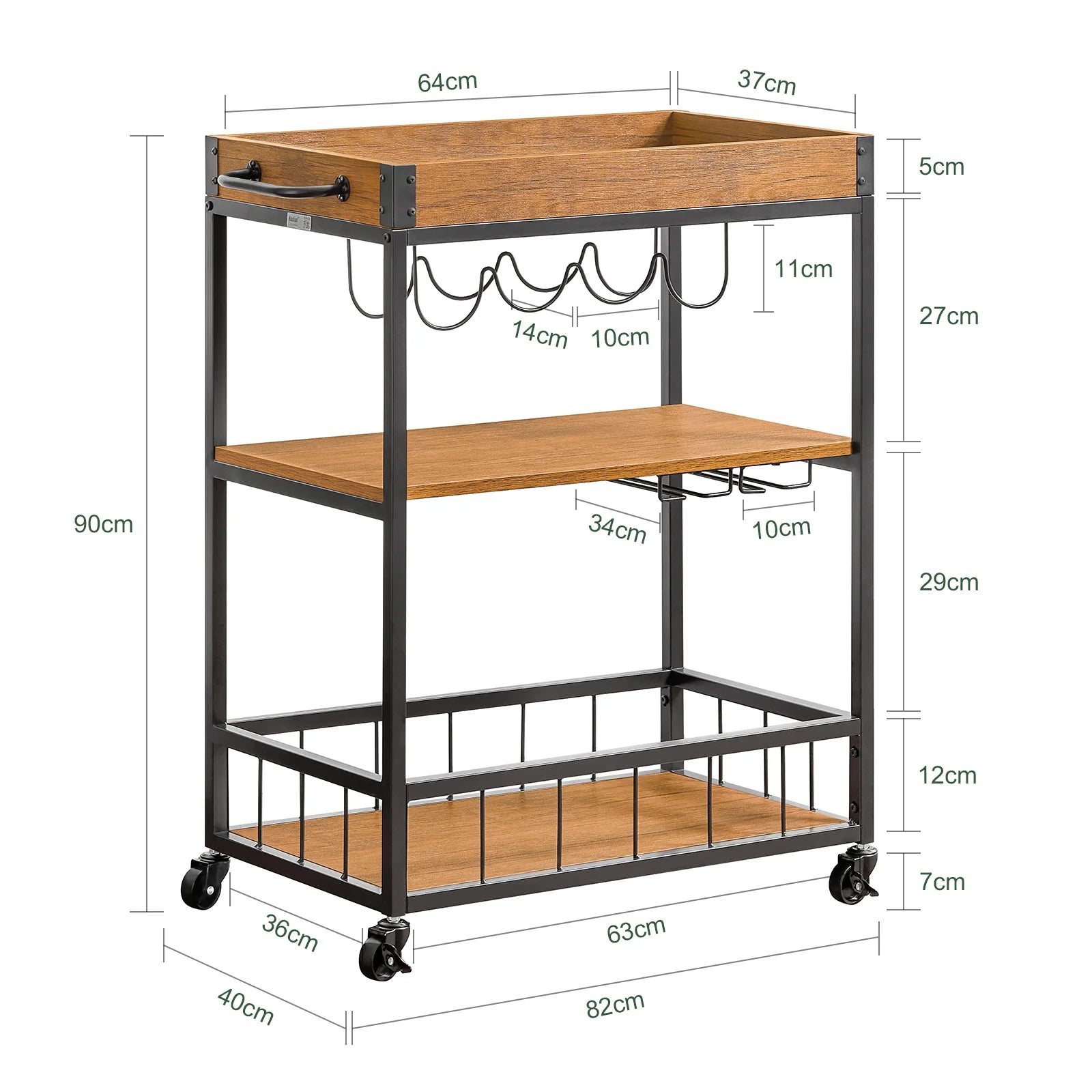 Bring en unik blanding af rustik charme og moderne funktionalitet til dit hjem med denne serveringsvogn i industriel vintage-stil. Den er perfekt til at servere mad og drikke, og du kan nemt transportere ting fra rum til rum. De tre hylder giver dig masser af opbevaringsplads til tallerkener, glas og snacks. Den øverste hylde kan tages af og bruges som en smart bakke.MDF med et flot træ-look og en sort, pulverlakeret stålramme, der sikrer stabilitet og lang levetid. De fire drejehjul, hvoraf to har bremser, gør det let at flytte vognen og placere den sikkert, hvor du har brug for den.