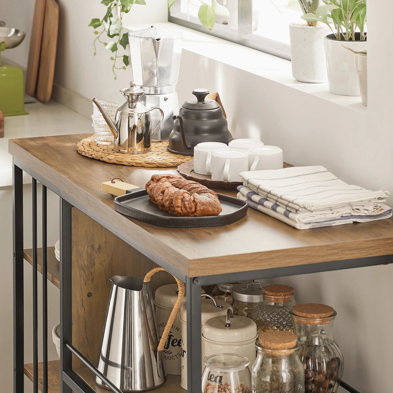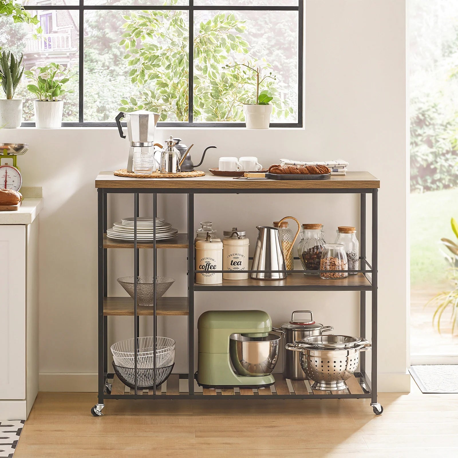 Vognen har i alt fem hylder – to store og tre på siden – som giver dig masser af opbevaringsplads til alt fra køkkenudstyr til dekoration. De fire hjul, hvoraf to kan låses, gør det let at flytte vognen rundt i køkkenet, spisestuen eller stuen. Den er fremstillet af holdbar MDF med et flot træ-look og en pulverlakeret stålramme, der sikrer stabilitet og lang levetid.