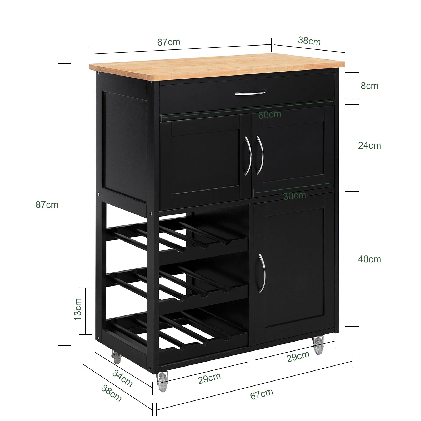 Optimer dit køkken med denne smarte og fleksible køkkenvogn. Vognen er fremstillet af holdbar E1-grade MDF med en robust bordplade i massivt gummitræ, og den er ideel til små rum. Med sit stilfulde design og praktiske funktioner, som et skab, en skuffe og en vinhylle, kan du nemt holde styr på køkkenredskaber, morgenmadsfavoritter og vin.